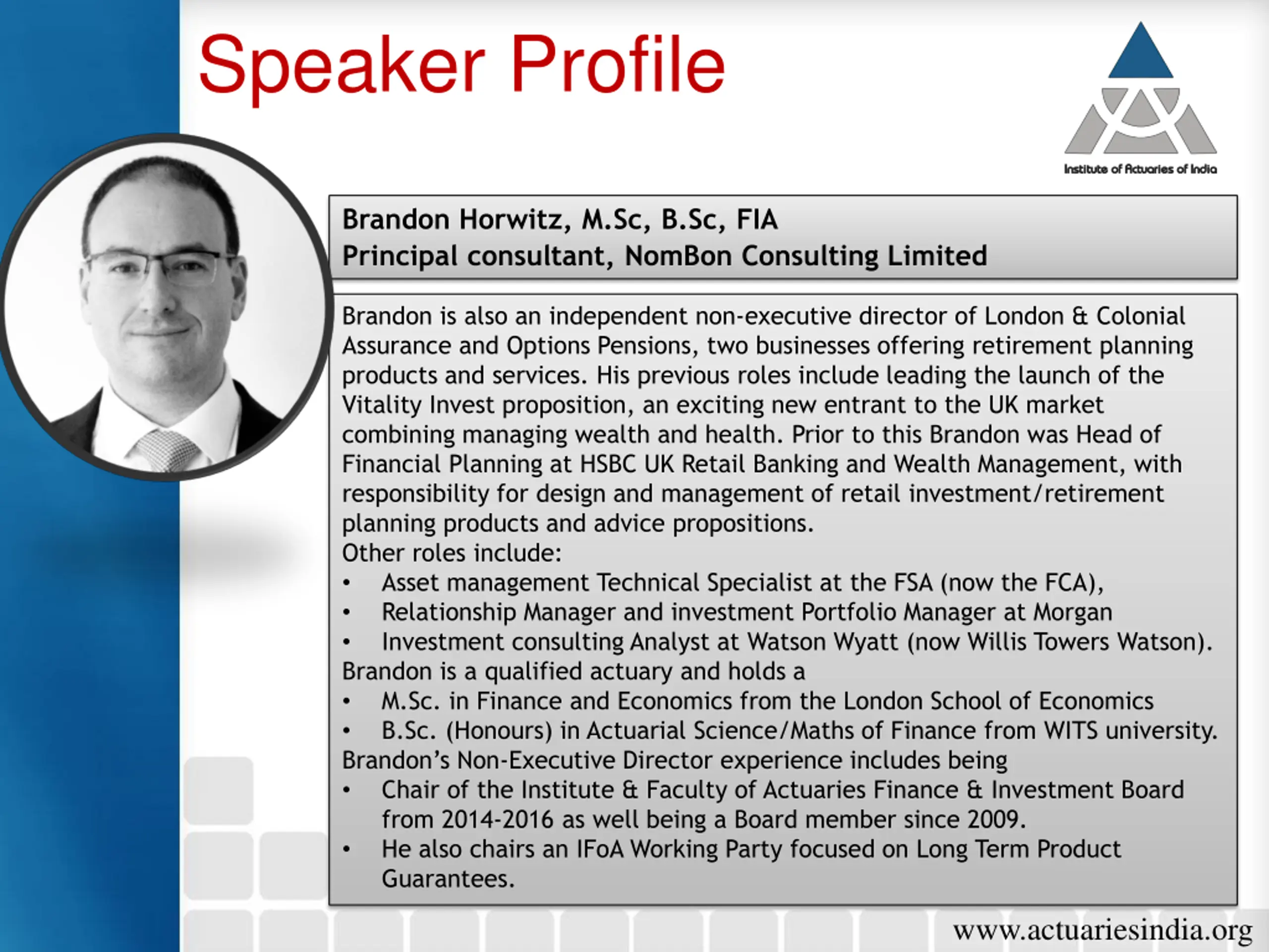 Speaker Profile Brandon Horwitz, M.Sc, B.Sc, FIA Principal consultant, NomBon Consulting Limited Brandon is also an independent non-executive director of London & Colonial Assurance and Options Pensions, two businesses offering retirement planning products and services. His previous roles include leading the launch of the Vitality Invest proposition, an exciting new entrant to the UK market combining managing wealth and health. Prior to this Brandon was Head of Financial Planning at HSBC UK Retail Banking and Wealth Management, with responsibility for design and management of retail investment/retirement planning products and advice propositions. Other roles include: Asset management Technical Specialist at the FSA (now the FCA), Relationship Manager and investment Portfolio Manager at Morgan Investment consulting Analyst at Watson Wyatt (now Willis Towers Watson). Brandon is a qualified actuary and holds a M.Sc. in Finance and Economics from the London School of Economics B.Sc. (Honours) in Actuarial Science/Maths of Finance from WITS university. Brandon s Non-Executive Director experience includes being Chair of the Institute & Faculty of Actuaries Finance & Investment Board from 2014-2016 as well being a Board member since 2009. He also chairs an IFoA Working Party focused on Long Term Product Guarantees. 5 www.actuariesindia.org