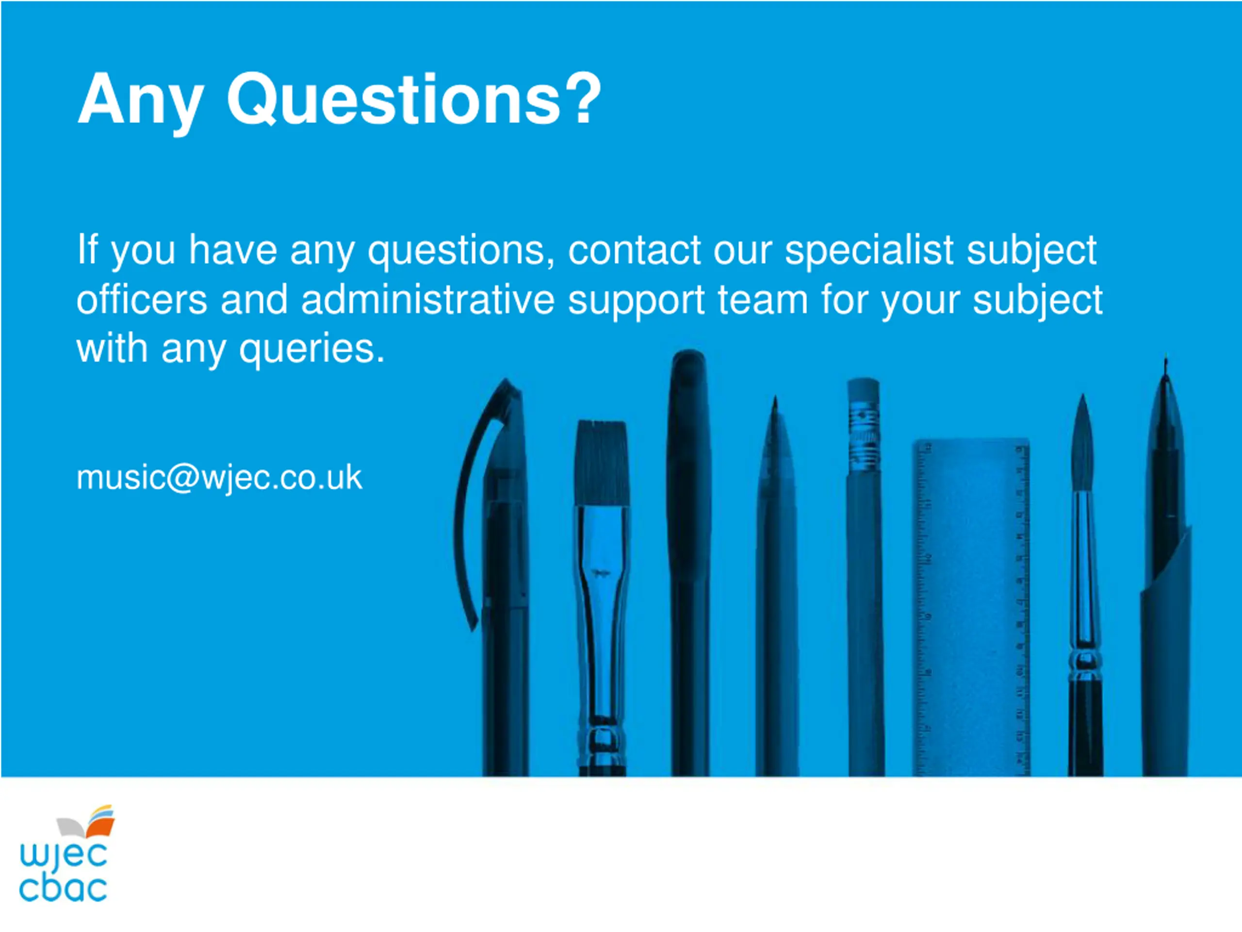 Any Questions? If you have any questions, contact our specialist subject officers and administrative support team for your subject with any queries. music@wjec.co.uk