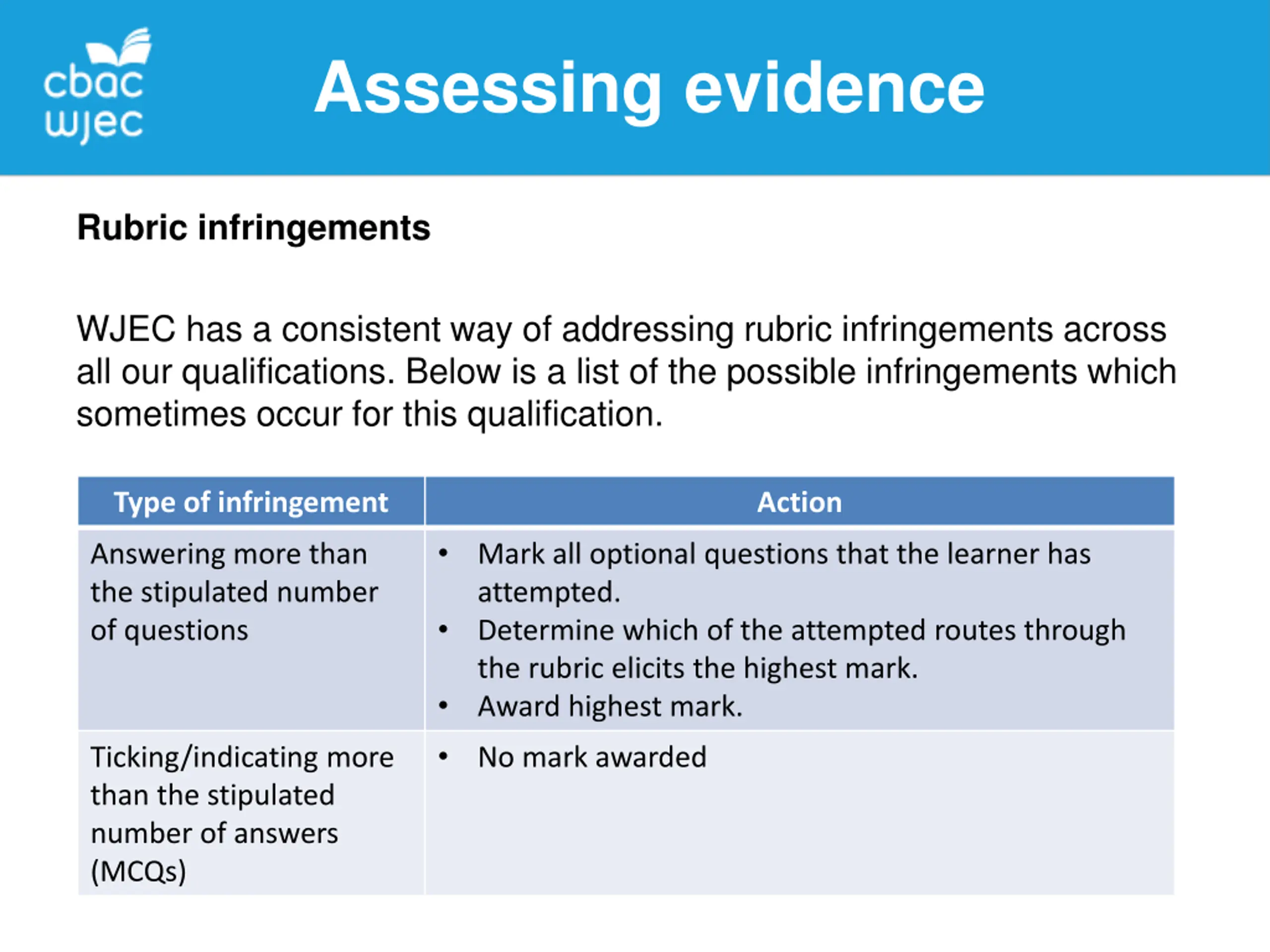 Assessing evidence Rubric infringements WJEC has a consistent way of addressing rubric infringements across all our qualifications. Below is a list of the possible infringements which sometimes occur for this qualification. Type of infringement Action Answering more than the stipulated number of questions Mark all optional questions that the learner has attempted. Determine which of the attempted routes through the rubric elicits the highest mark. Award highest mark. Ticking/indicating more than the stipulated number of answers (MCQs) No mark awarded