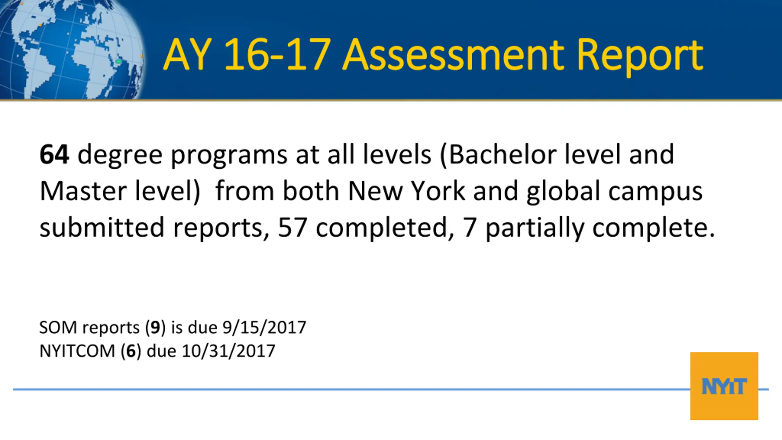 AY 16 AY 16- -17 Assessment Report 17 Assessment Report 64 degree programs at all levels (Bachelor level and Master level) from both New York and global campus submitted reports, 57 completed, 7 partially complete. SOM reports (9) is due 9/15/2017 NYITCOM (6) due 10/31/2017