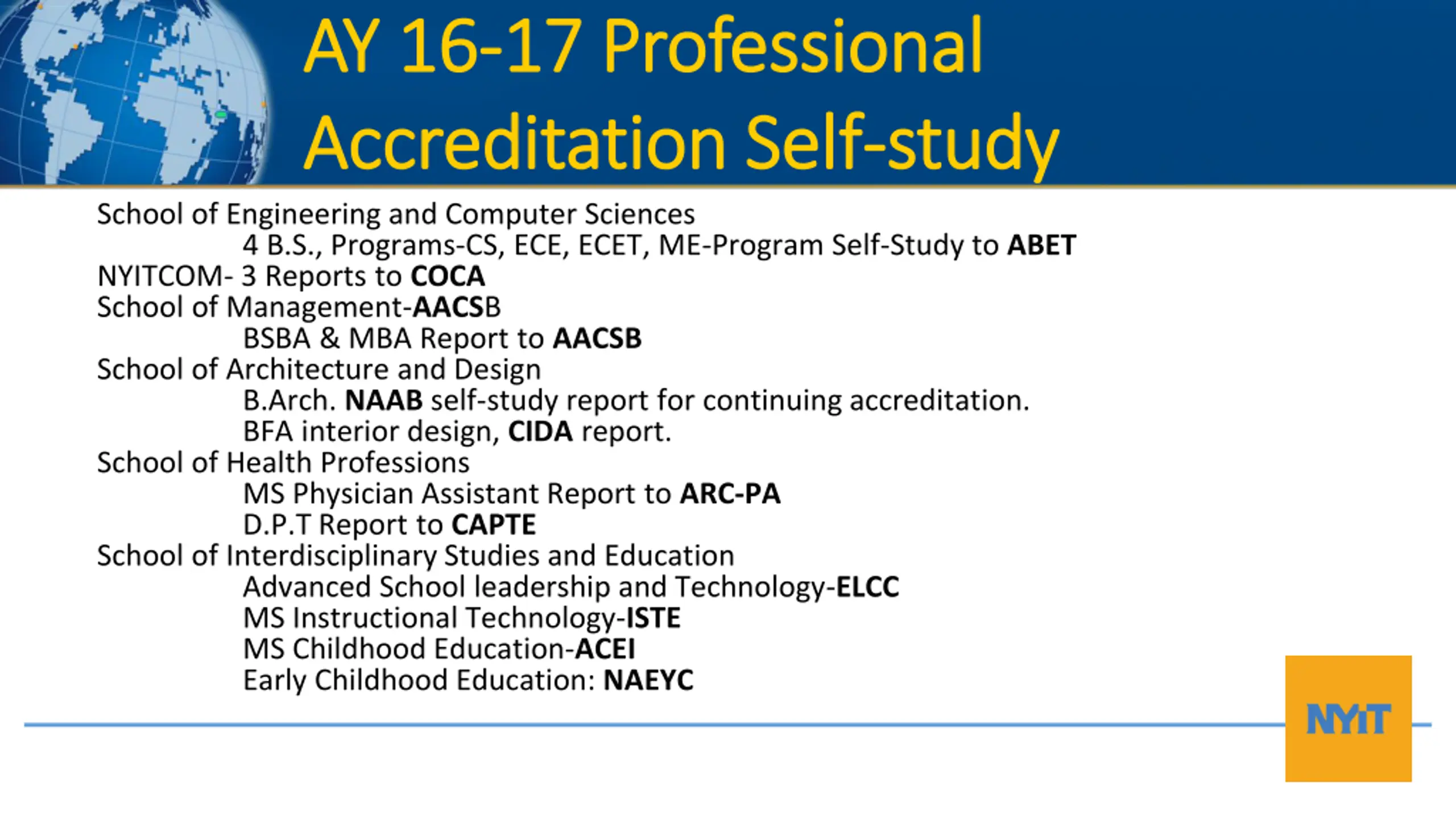 AY 16 AY 16- -17 Professional 17 Professional Accreditation Self Accreditation Self- -study study School of Engineering and Computer Sciences 4 B.S., Programs-CS, ECE, ECET, ME-Program Self-Study to ABET NYITCOM- 3 Reports to COCA School of Management-AACSB BSBA & MBA Report to AACSB School of Architecture and Design B.Arch. NAAB self-study report for continuing accreditation. BFA interior design, CIDA report. School of Health Professions MS Physician Assistant Report to ARC-PA D.P.T Report to CAPTE School of Interdisciplinary Studies and Education Advanced School leadership and Technology-ELCC MS Instructional Technology-ISTE MS Childhood Education-ACEI Early Childhood Education: NAEYC