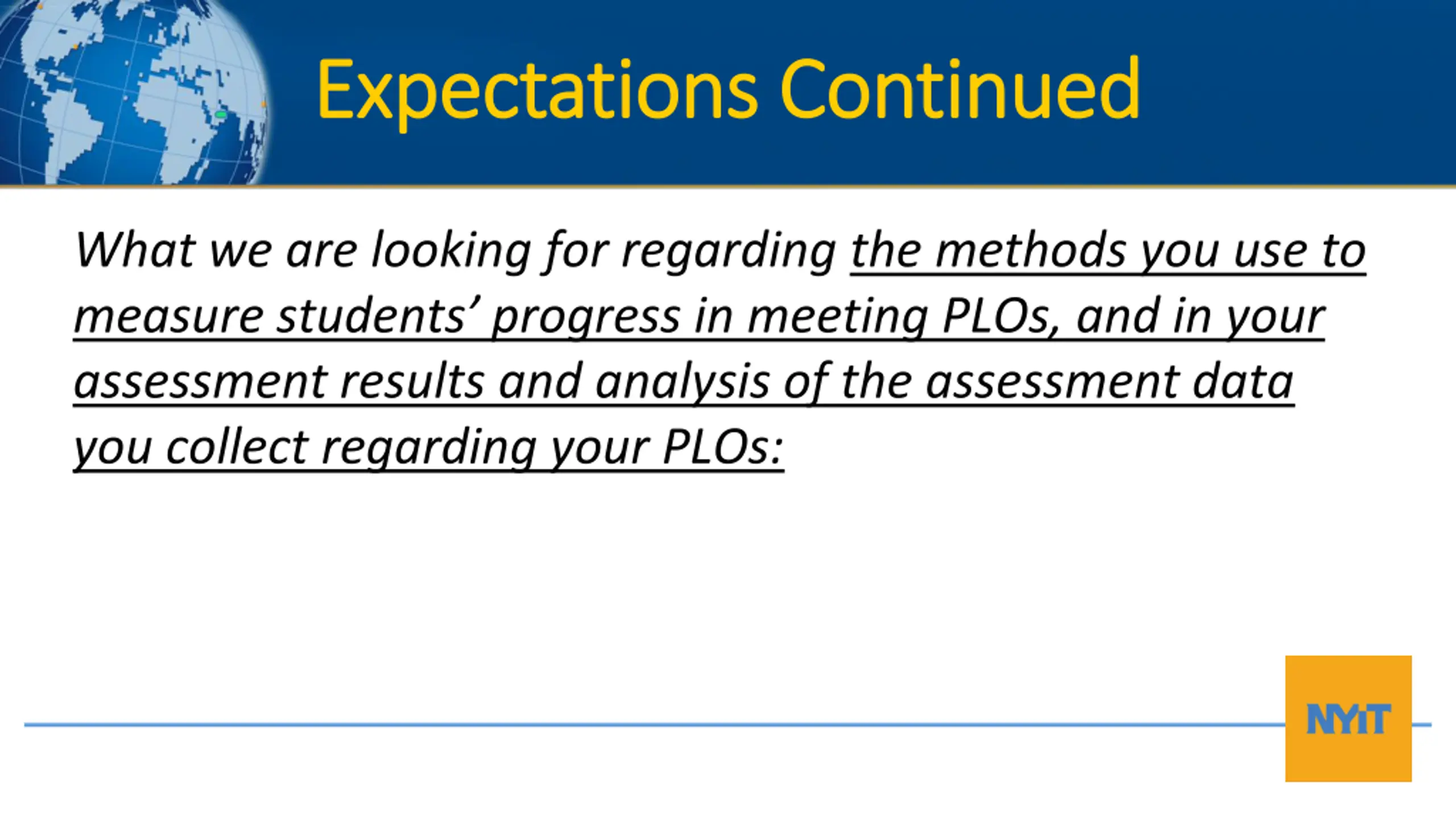Expectations Continued Expectations Continued What we are looking for regarding the methods you use to measure students progress in meeting PLOs, and in your assessment results and analysis of the assessment data you collect regarding your PLOs: