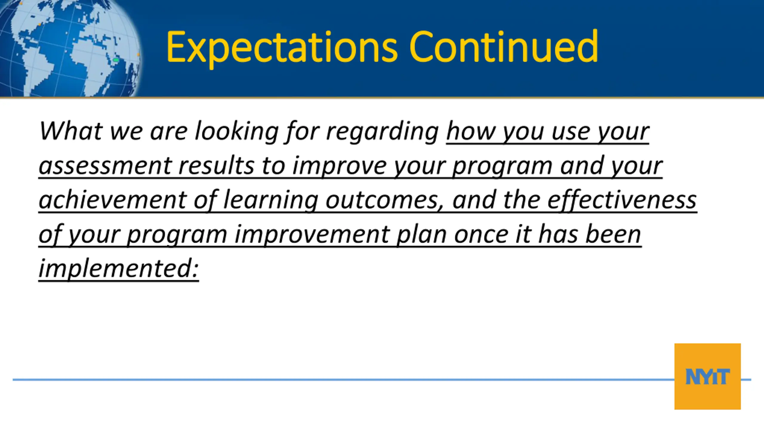 Expectations Continued Expectations Continued What we are looking for regarding how you use your assessment results to improve your program and your achievement of learning outcomes, and the effectiveness of your program improvement plan once it has been implemented: