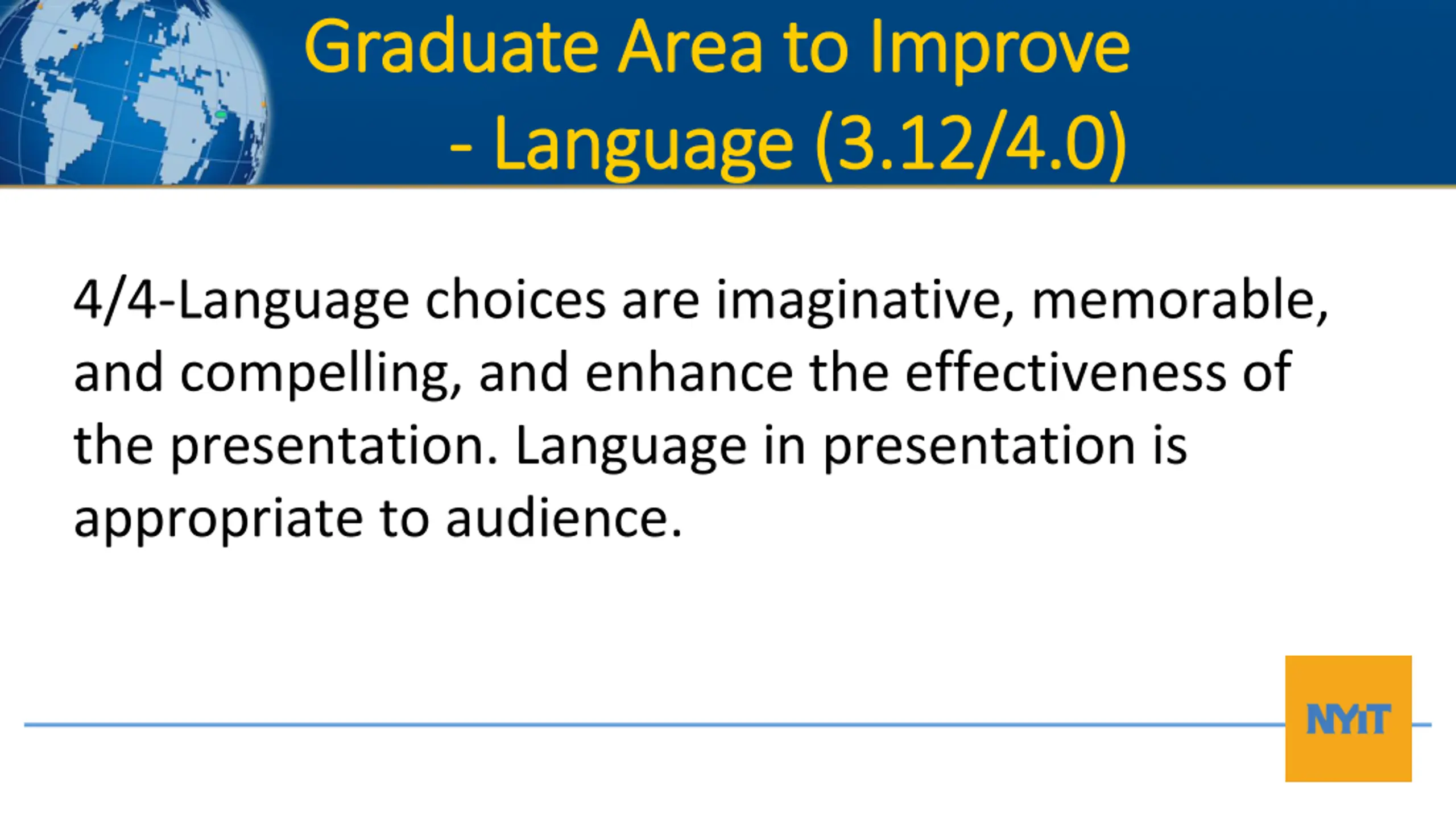 Graduate Area to Improve Graduate Area to Improve - - Language (3.12/4.0) Language (3.12/4.0) 4/4-Language choices are imaginative, memorable, and compelling, and enhance the effectiveness of the presentation. Language in presentation is appropriate to audience.