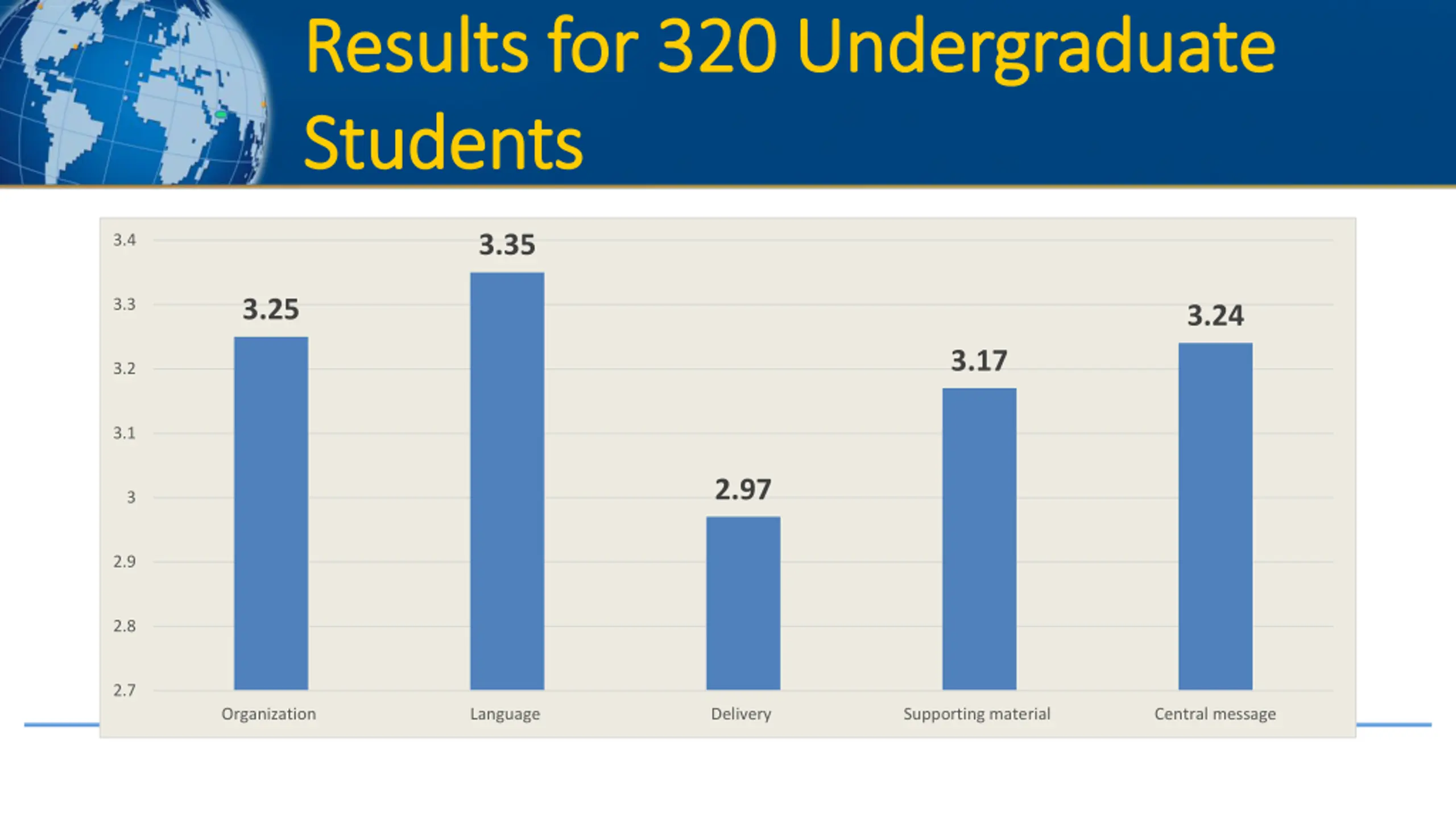 Results for Results for 192 Graduate 192 Graduate Students Students 3.28 3.3 3.24 3.25 3.2 3.2 3.17 3.15 3.12 3.1 3.05 3 Organization Language Delivery Supporting material Central message