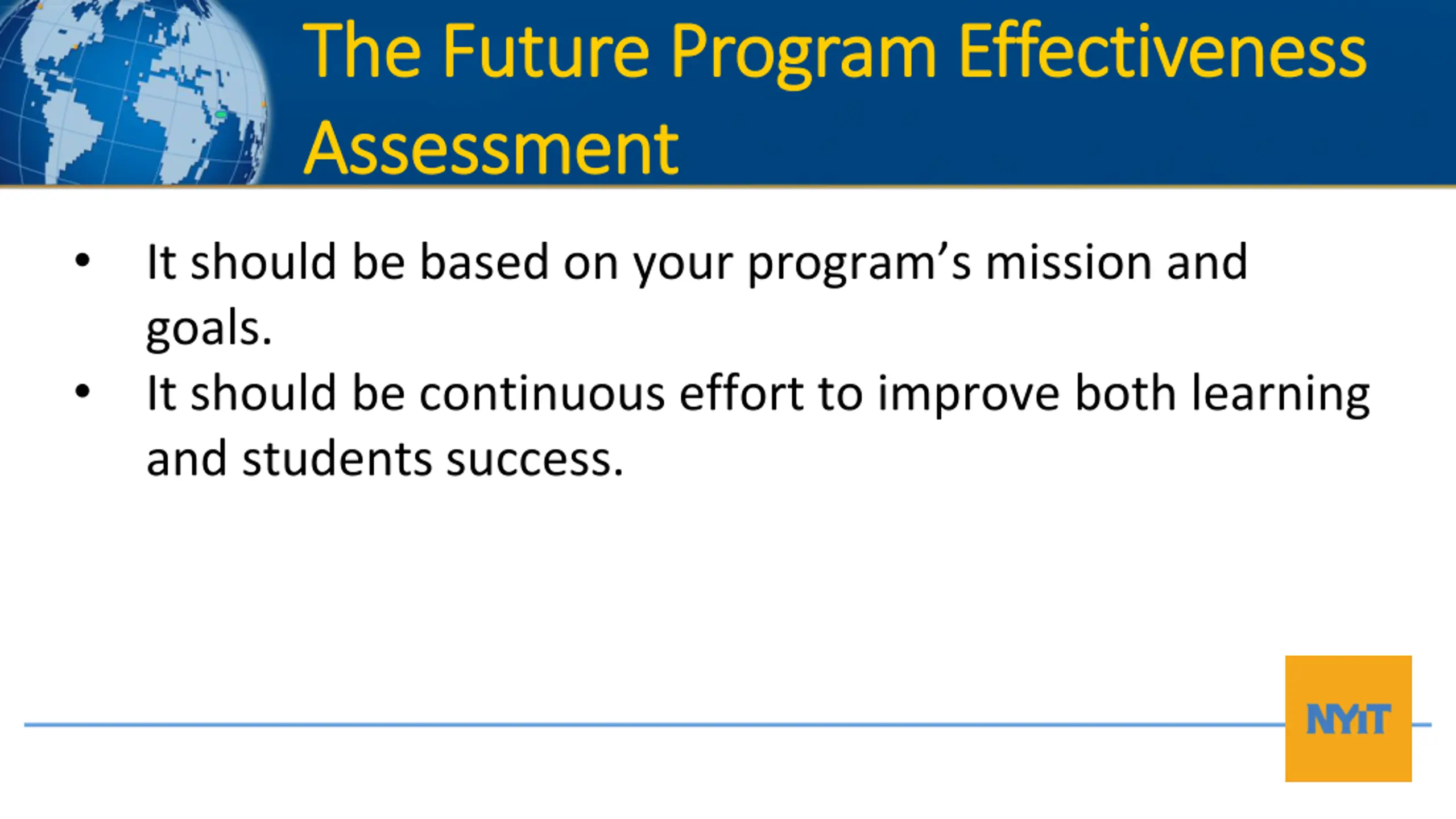The Future Program Effectiveness The Future Program Effectiveness Assessment Assessment It should be based on your program s mission and goals. It should be continuous effort to improve both learning and students success.