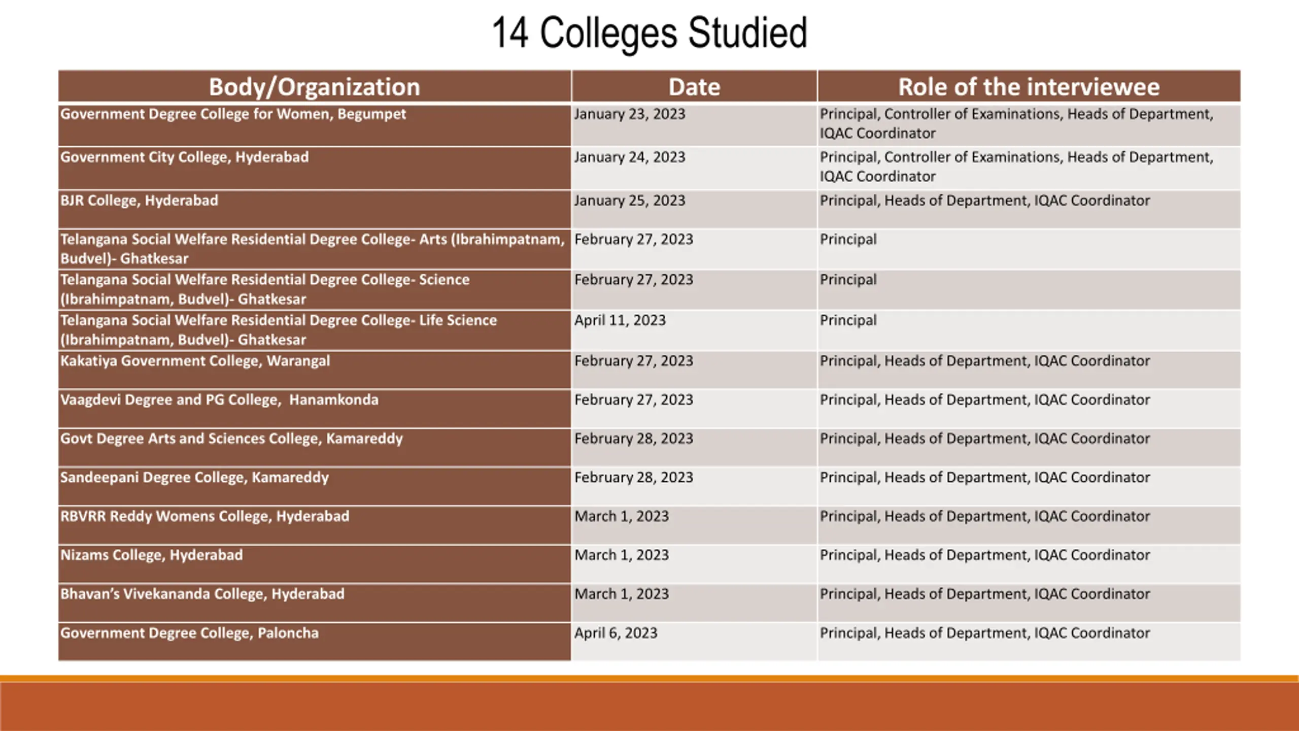 14 Colleges Studied Body/Organization Date Role of the interviewee Principal, Controller of Examinations, Heads of Department, IQAC Coordinator Principal, Controller of Examinations, Heads of Department, IQAC Coordinator Principal, Heads of Department, IQAC Coordinator Government Degree College for Women, Begumpet January 23, 2023 Government City College, Hyderabad January 24, 2023 BJR College, Hyderabad January 25, 2023 Telangana Social Welfare Residential Degree College- Arts (Ibrahimpatnam, Budvel)- Ghatkesar Telangana Social Welfare Residential Degree College- Science (Ibrahimpatnam, Budvel)- Ghatkesar Telangana Social Welfare Residential Degree College- Life Science (Ibrahimpatnam, Budvel)- Ghatkesar Kakatiya Government College, Warangal February 27, 2023 Principal February 27, 2023 Principal April 11, 2023 Principal February 27, 2023 Principal, Heads of Department, IQAC Coordinator Vaagdevi Degree and PG College, Hanamkonda February 27, 2023 Principal, Heads of Department, IQAC Coordinator Govt Degree Arts and Sciences College, Kamareddy February 28, 2023 Principal, Heads of Department, IQAC Coordinator Sandeepani Degree College, Kamareddy February 28, 2023 Principal, Heads of Department, IQAC Coordinator RBVRR Reddy Womens College, Hyderabad March 1, 2023 Principal, Heads of Department, IQAC Coordinator Nizams College, Hyderabad March 1, 2023 Principal, Heads of Department, IQAC Coordinator Bhavan s Vivekananda College, Hyderabad March 1, 2023 Principal, Heads of Department, IQAC Coordinator Government Degree College, Paloncha April 6, 2023 Principal, Heads of Department, IQAC Coordinator