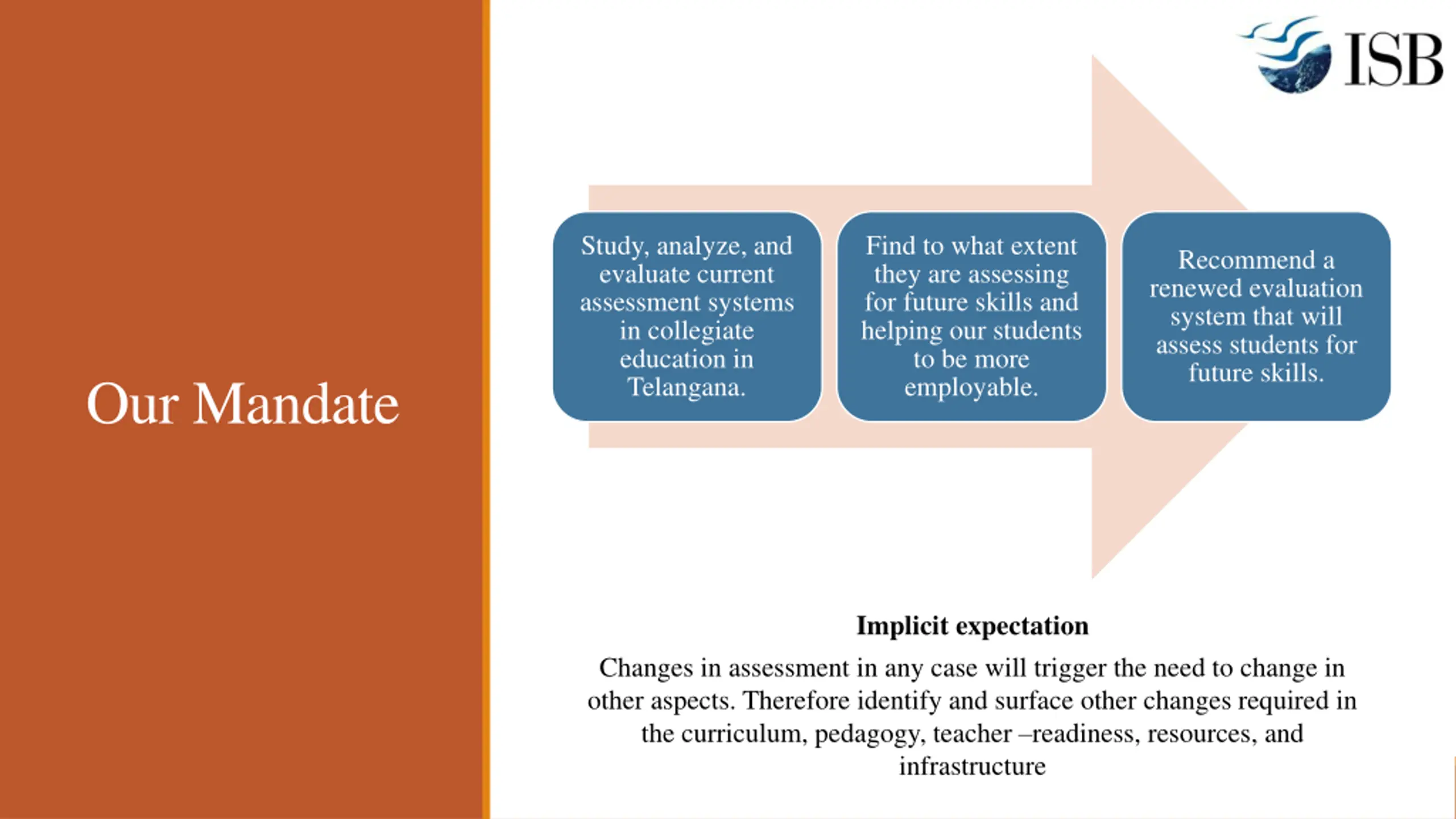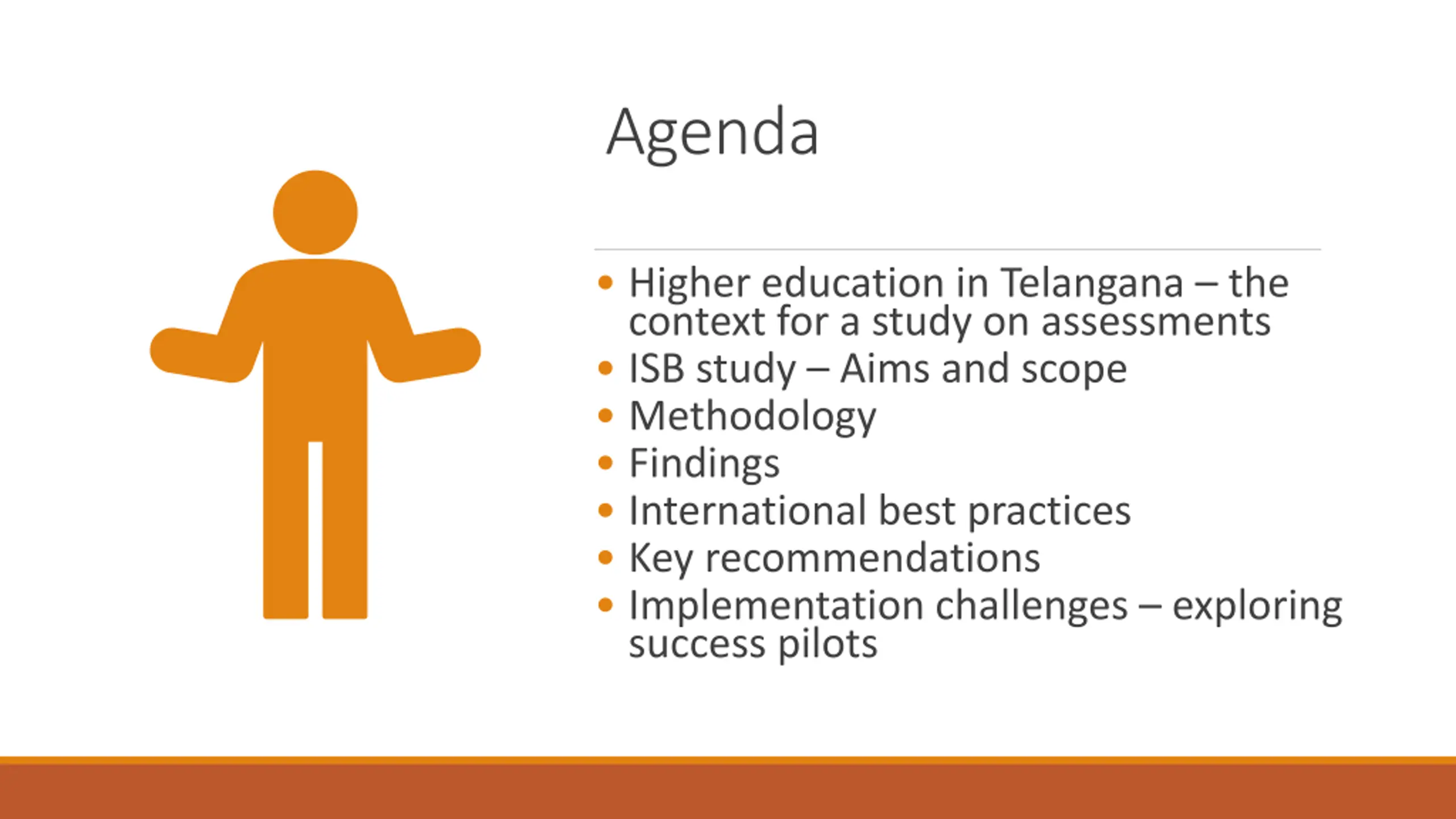 Agenda Higher education in Telangana the context for a study on assessments ISB study Aims and scope Methodology Findings International best practices Key recommendations Implementation challenges exploring success pilots