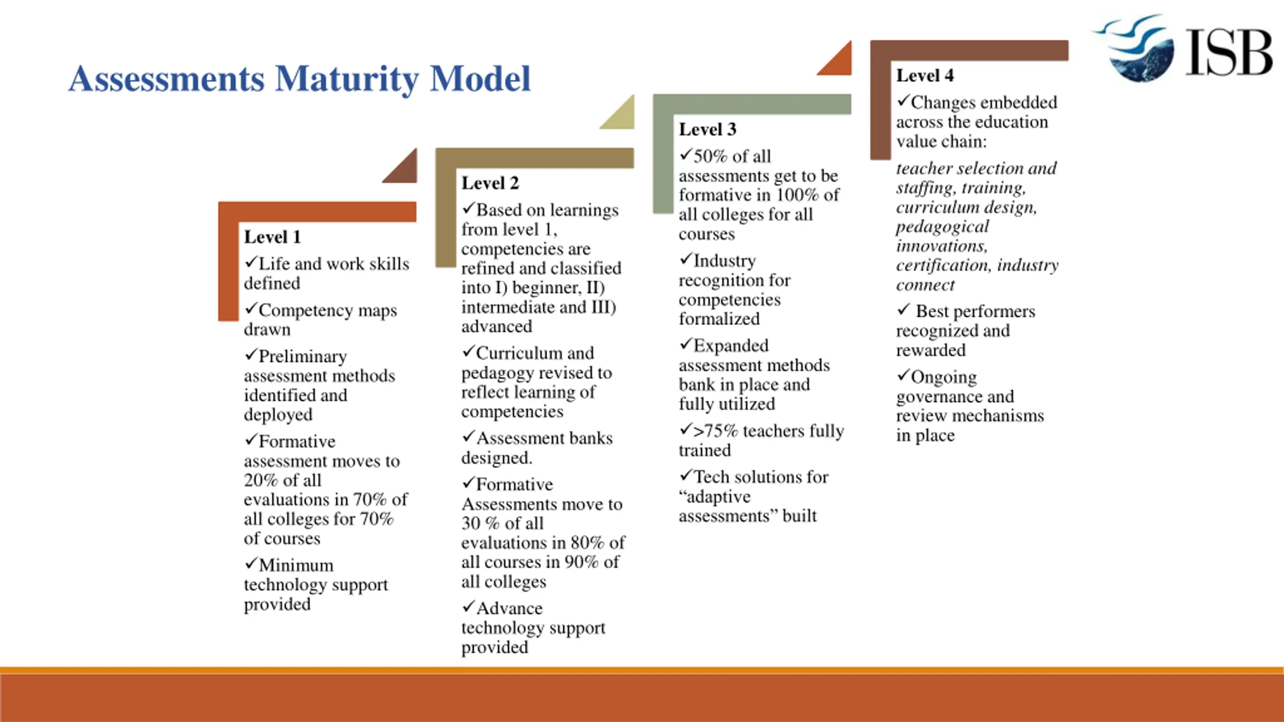 Assessments Maturity Model Level 4 Changes embedded across the education value chain: teacher selection and staffing, training, curriculum design, pedagogical innovations, certification, industry connect Best performers recognized and rewarded Ongoing governance and review mechanisms in place Level 3 50% of all assessments get to be formative in 100% of all colleges for all courses Industry recognition for competencies formalized Expanded assessment methods bank in place and fully utilized >75% teachers fully trained Tech solutions for adaptive assessments built Level 2 Based on learnings from level 1, competencies are refined and classified into I) beginner, II) intermediate and III) advanced Curriculum and pedagogy revised to reflect learning of competencies Assessment banks designed. Formative Assessments move to 30 % of all evaluations in 80% of all courses in 90% of all colleges Advance technology support provided Level 1 Life and work skills defined Competency maps drawn Preliminary assessment methods identified and deployed Formative assessment moves to 20% of all evaluations in 70% of all colleges for 70% of courses Minimum technology support provided