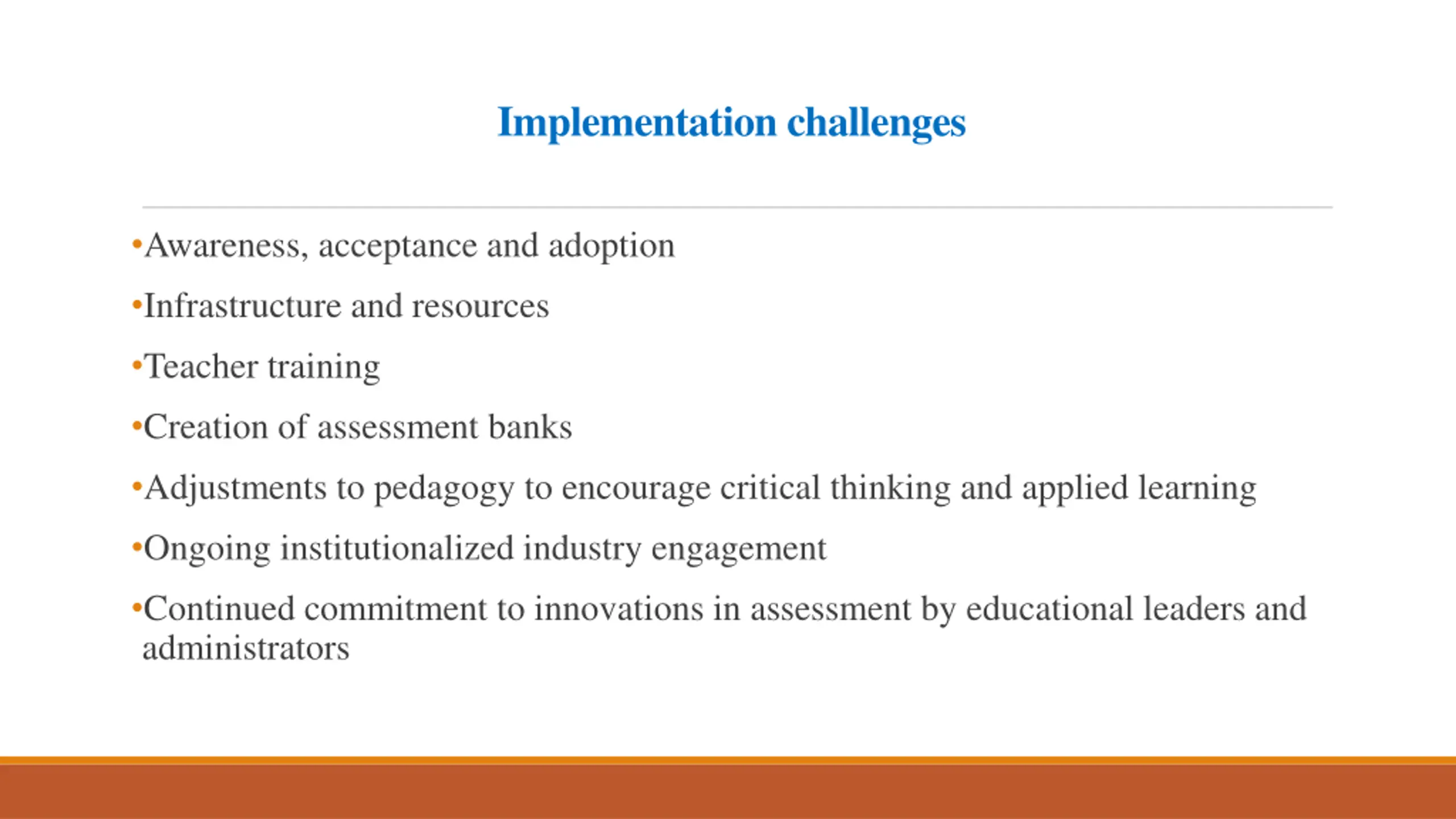 Implementation challenges Awareness, acceptance and adoption Infrastructure and resources Teacher training Creation of assessment banks Adjustments to pedagogy to encourage critical thinking and applied learning Ongoing institutionalized industry engagement Continued commitment to innovations in assessment by educational leaders and administrators