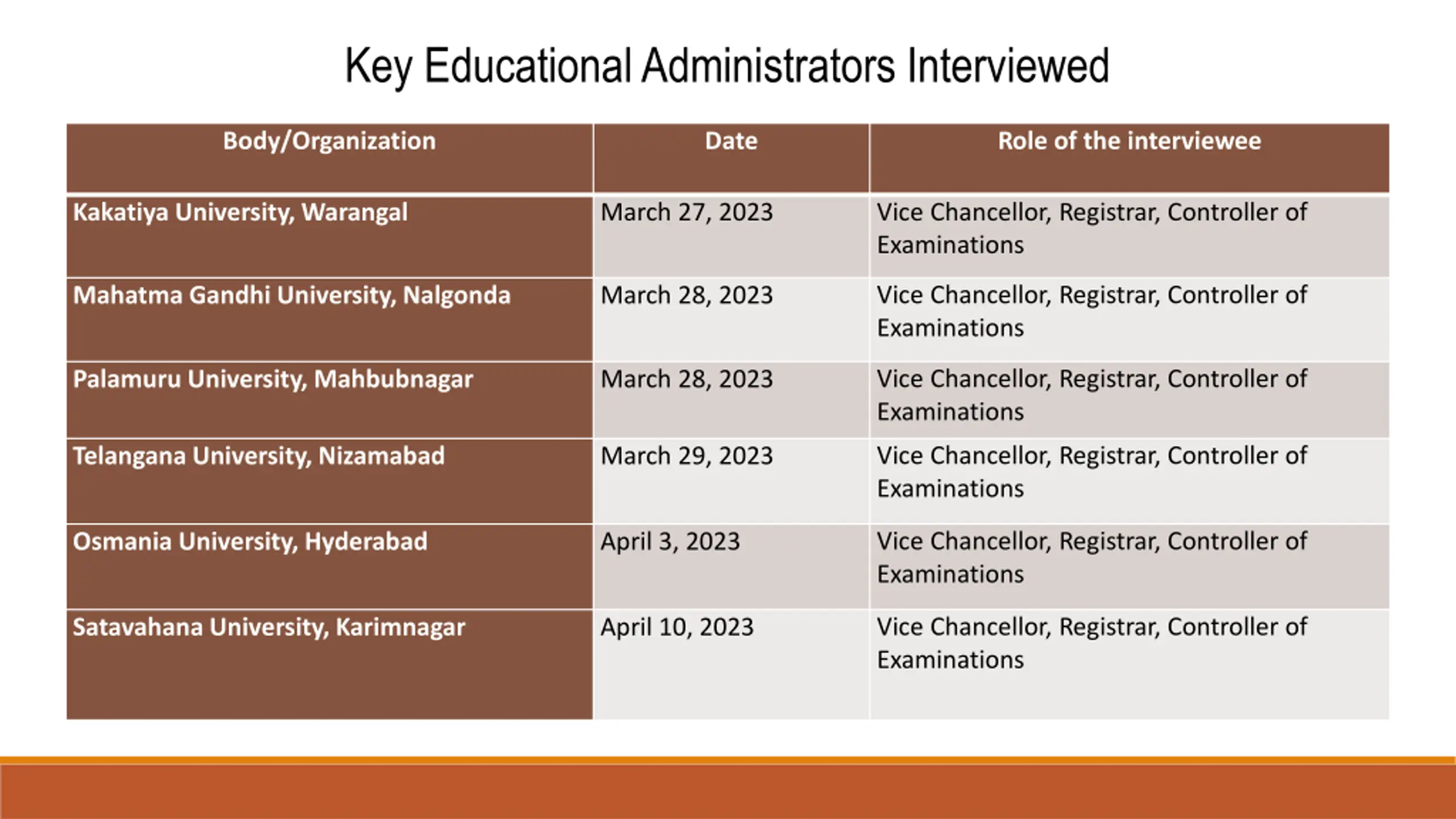 Key Educational Administrators Interviewed Body/Organization Date Role of the interviewee Vice Chancellor, Registrar, Controller of Examinations Kakatiya University, Warangal March 27, 2023 Vice Chancellor, Registrar, Controller of Examinations Mahatma Gandhi University, Nalgonda March 28, 2023 Vice Chancellor, Registrar, Controller of Examinations Palamuru University, Mahbubnagar March 28, 2023 Vice Chancellor, Registrar, Controller of Examinations Telangana University, Nizamabad March 29, 2023 Vice Chancellor, Registrar, Controller of Examinations Osmania University, Hyderabad April 3, 2023 Vice Chancellor, Registrar, Controller of Examinations Satavahana University, Karimnagar April 10, 2023