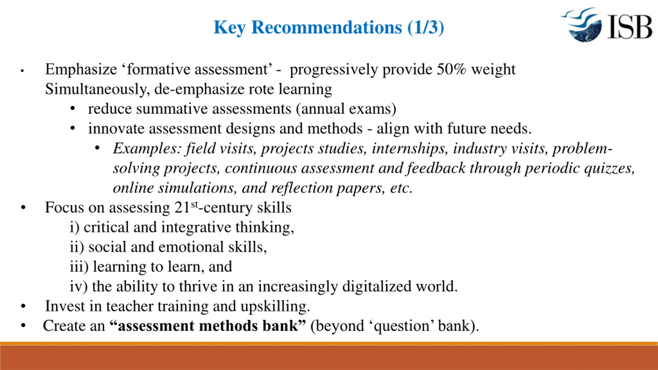 Key Recommendations (1/3) Emphasize formative assessment - progressively provide 50% weight Simultaneously, de-emphasize rote learning reduce summative assessments (annual exams) innovate assessment designs and methods - align with future needs. Examples: field visits, projects studies, internships, industry visits, problem- solving projects, continuous assessment and feedback through periodic quizzes, online simulations, and reflection papers, etc. Focus on assessing 21st-century skills i) critical and integrative thinking, ii) social and emotional skills, iii) learning to learn, and iv) the ability to thrive in an increasingly digitalized world. Invest in teacher training and upskilling. Create an assessment methods bank (beyond question bank).