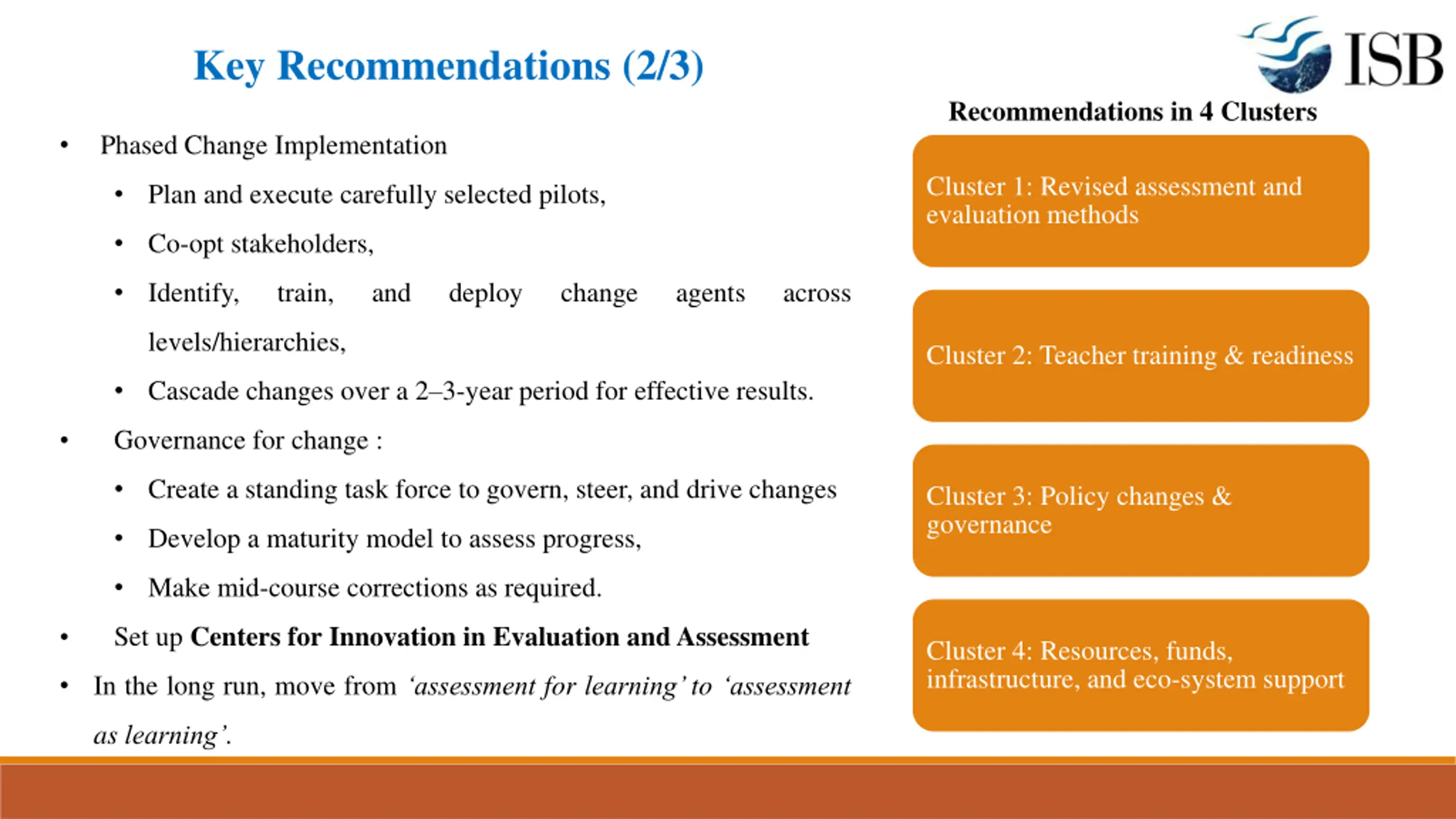Key Recommendations (2/3) Recommendations in 4 Clusters Phased Change Implementation Cluster 1: Revised assessment and evaluation methods Plan and execute carefully selected pilots, Co-opt stakeholders, Identify, train, and deploy change agents across levels/hierarchies, Cluster 2: Teacher training & readiness Cascade changes over a 2 3-year period for effective results. Governance for change : Create a standing task force to govern, steer, and drive changes Cluster 3: Policy changes & governance Develop a maturity model to assess progress, Make mid-course corrections as required. Set up Centers for Innovation in Evaluation and Assessment Cluster 4: Resources, funds, infrastructure, and eco-system support In the long run, move from assessment for learning to assessment as learning .