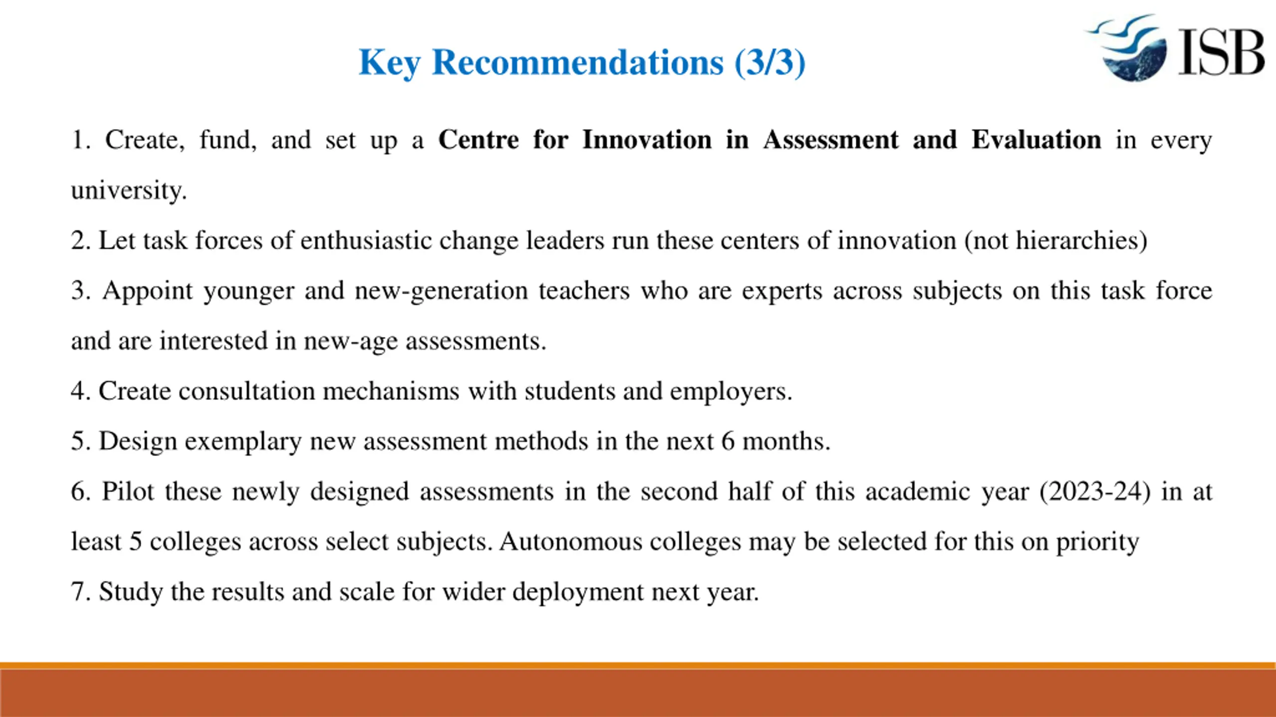 Key Recommendations (3/3) 1. Create, fund, and set up a Centre for Innovation in Assessment and Evaluation in every university. 2. Let task forces of enthusiastic change leaders run these centers of innovation (not hierarchies) 3. Appoint younger and new-generation teachers who are experts across subjects on this task force and are interested in new-age assessments. 4. Create consultation mechanisms with students and employers. 5. Design exemplary new assessment methods in the next 6 months. 6. Pilot these newly designed assessments in the second half of this academic year (2023-24) in at least 5 colleges across select subjects. Autonomous colleges may be selected for this on priority 7. Study the results and scale for wider deployment next year.