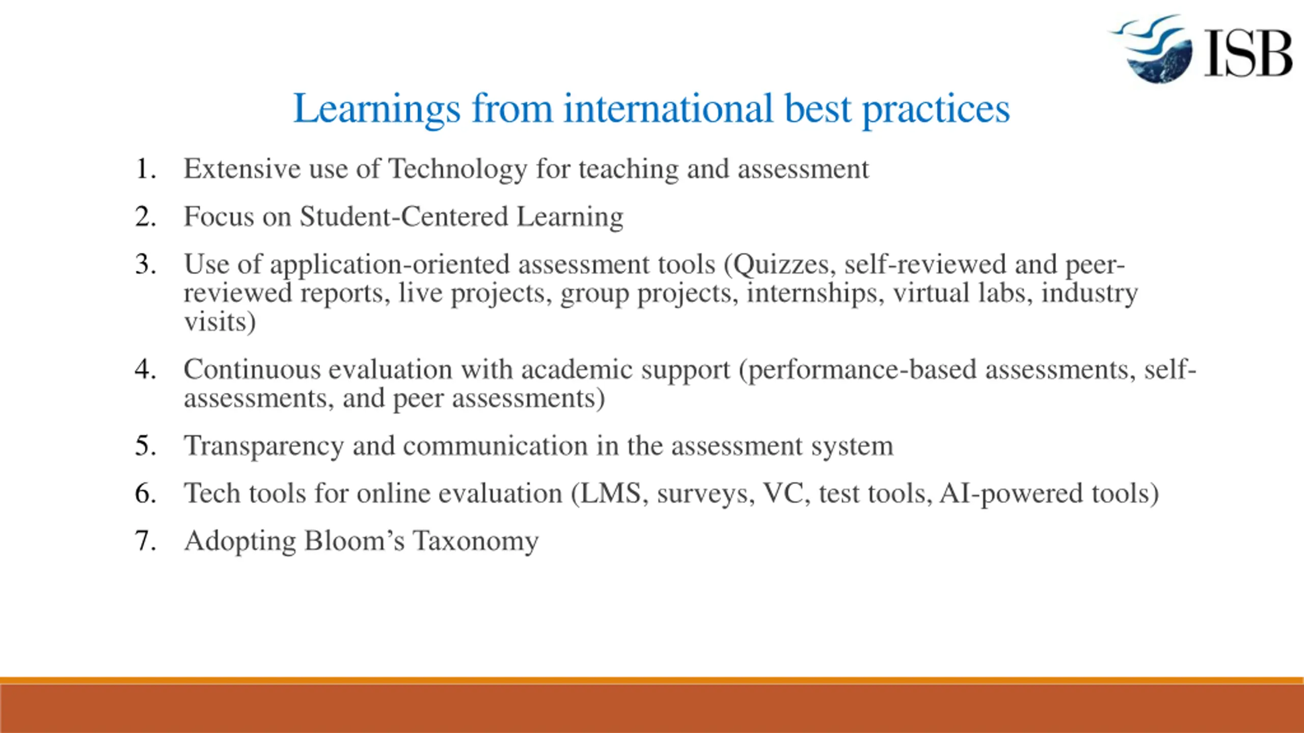 Learnings from international best practices 1. Extensive use of Technology for teaching and assessment 2. Focus on Student-Centered Learning 3. Use of application-oriented assessment tools (Quizzes, self-reviewed and peer- reviewed reports, live projects, group projects, internships, virtual labs, industry visits) 4. Continuous evaluation with academic support (performance-based assessments, self- assessments, and peer assessments) 5. Transparency and communication in the assessment system 6. Tech tools for online evaluation (LMS, surveys, VC, test tools, AI-powered tools) 7. Adopting Bloom s Taxonomy