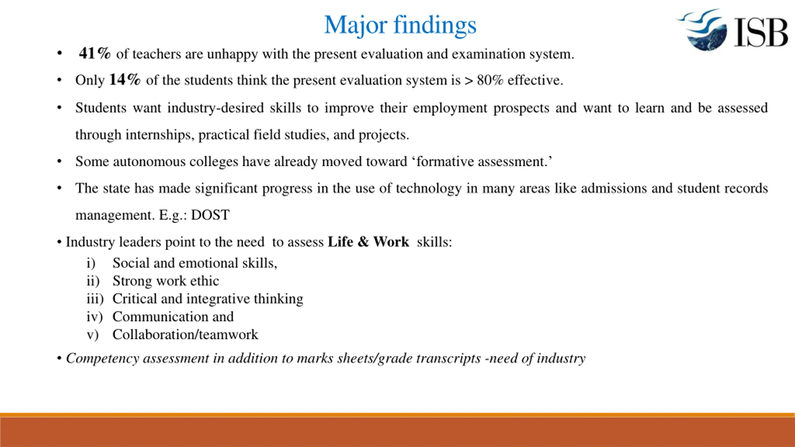 Major findings 41% of teachers are unhappy with the present evaluation and examination system. Only 14% of the students think the present evaluation system is > 80% effective. Students want industry-desired skills to improve their employment prospects and want to learn and be assessed through internships, practical field studies, and projects. Some autonomous colleges have already moved toward formative assessment. The state has made significant progress in the use of technology in many areas like admissions and student records management. E.g.: DOST Industry leaders point to the need to assess Life & Work skills: i) Social and emotional skills, ii) Strong work ethic iii) Critical and integrative thinking iv) Communication and v) Collaboration/teamwork Competency assessment in addition to marks sheets/grade transcripts -need of industry