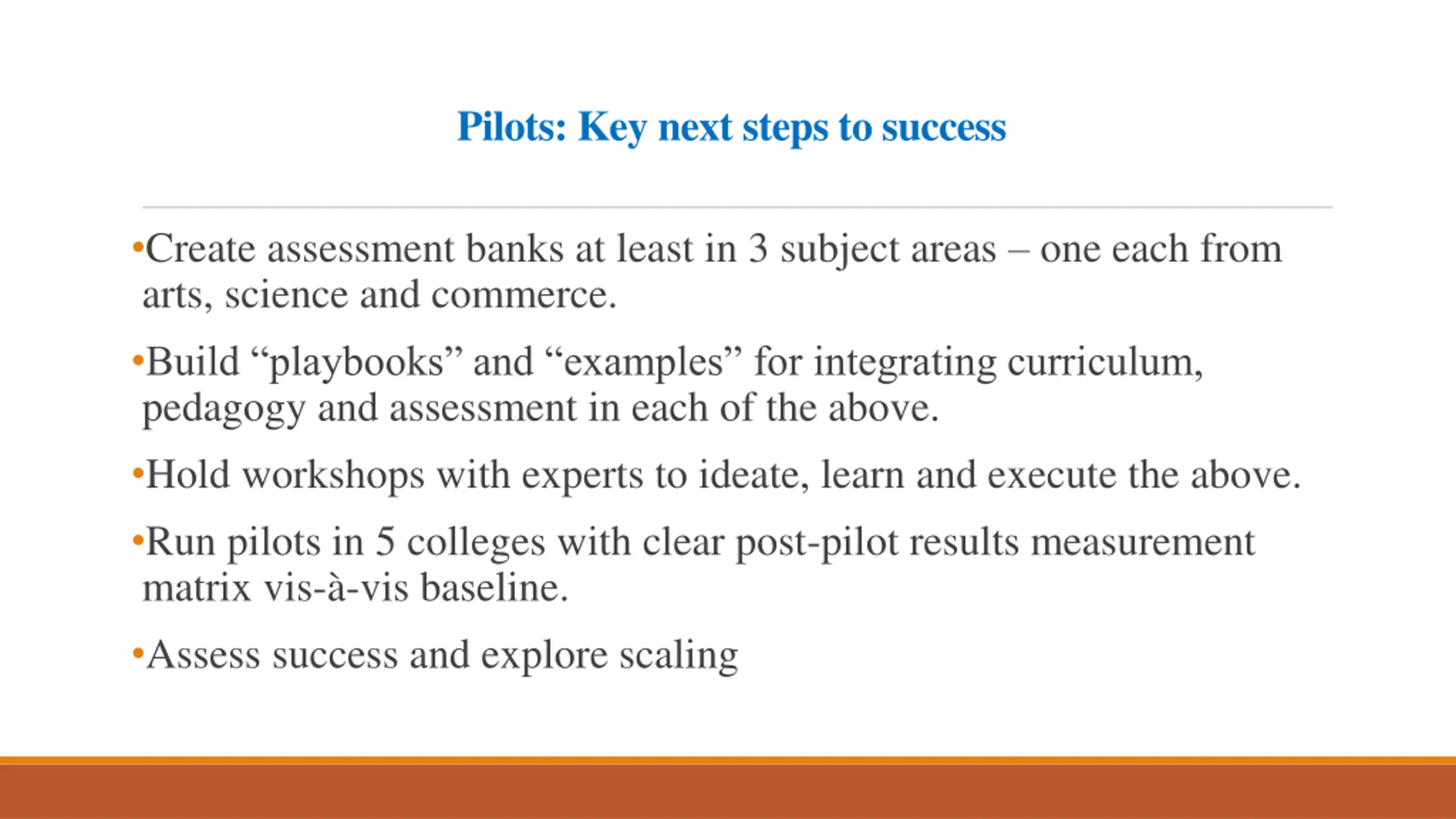 Pilots: Key next steps to success Create assessment banks at least in 3 subject areas one each from arts, science and commerce. Build playbooks and examples for integrating curriculum, pedagogy and assessment in each of the above. Hold workshops with experts to ideate, learn and execute the above. Run pilots in 5 colleges with clear post-pilot results measurement matrix vis- -vis baseline. Assess success and explore scaling