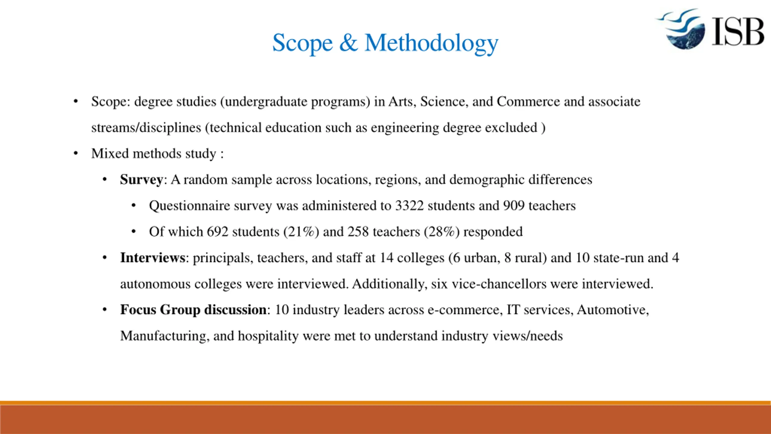 Scope & Methodology Scope: degree studies (undergraduate programs) in Arts, Science, and Commerce and associate streams/disciplines (technical education such as engineering degree excluded ) Mixed methods study : Survey: A random sample across locations, regions, and demographic differences Questionnaire survey was administered to 3322 students and 909 teachers Of which 692 students (21%) and 258 teachers (28%) responded Interviews: principals, teachers, and staff at 14 colleges (6 urban, 8 rural) and 10 state-run and 4 autonomous colleges were interviewed. Additionally, six vice-chancellors were interviewed. Focus Group discussion: 10 industry leaders across e-commerce, IT services, Automotive, Manufacturing, and hospitality were met to understand industry views/needs
