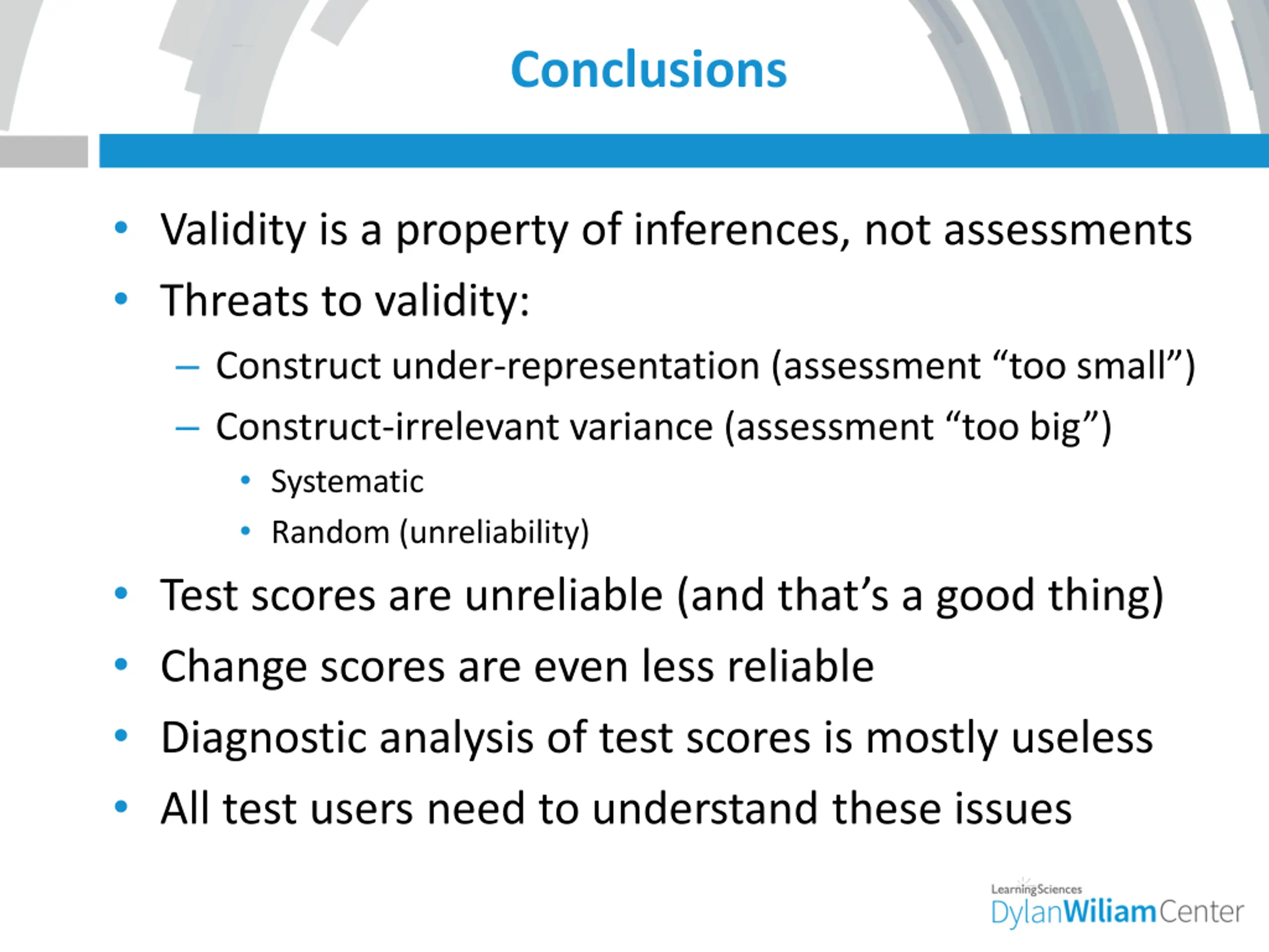 Conclusions Validity is a property of inferences, not assessments Threats to validity: Construct under-representation (assessment too small ) Construct-irrelevant variance (assessment too big ) Systematic Random (unreliability) Test scores are unreliable (and that s a good thing) Change scores are even less reliable Diagnostic analysis of test scores is mostly useless All test users need to understand these issues