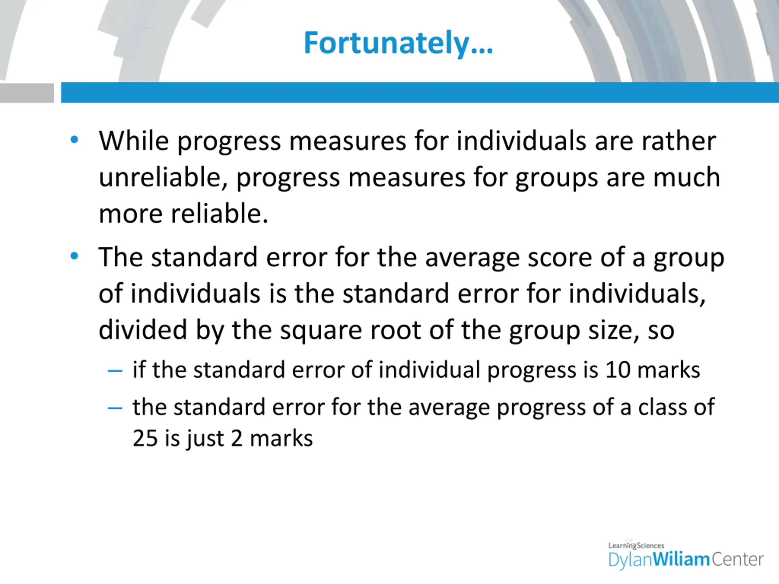 Fortunately While progress measures for individuals are rather unreliable, progress measures for groups are much more reliable. The standard error for the average score of a group of individuals is the standard error for individuals, divided by the square root of the group size, so if the standard error of individual progress is 10 marks the standard error for the average progress of a class of 25 is just 2 marks