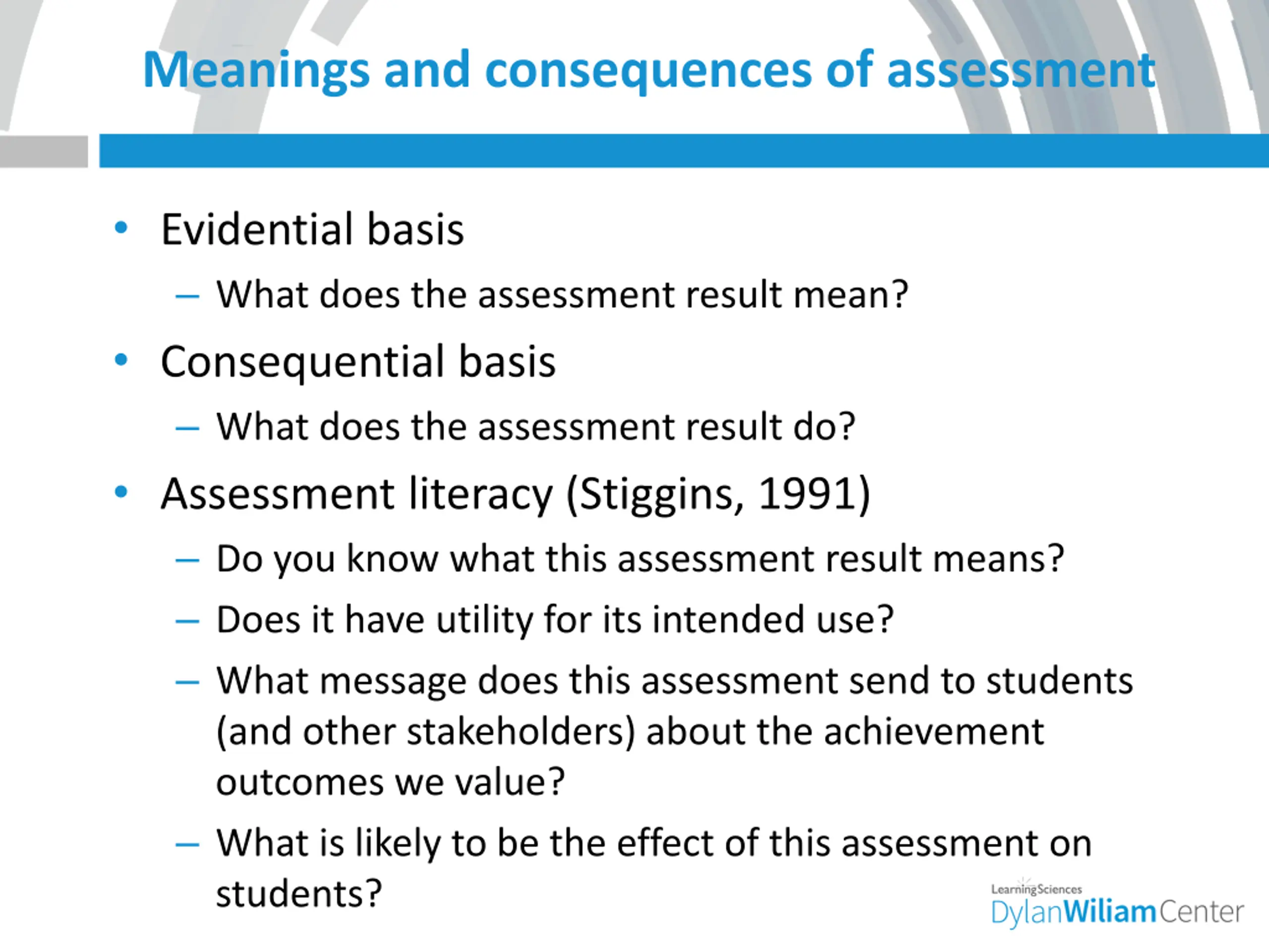 Meanings and consequences of assessment Evidential basis What does the assessment result mean? Consequential basis What does the assessment result do? Assessment literacy (Stiggins, 1991) Do you know what this assessment result means? Does it have utility for its intended use? What message does this assessment send to students (and other stakeholders) about the achievement outcomes we value? What is likely to be the effect of this assessment on students?