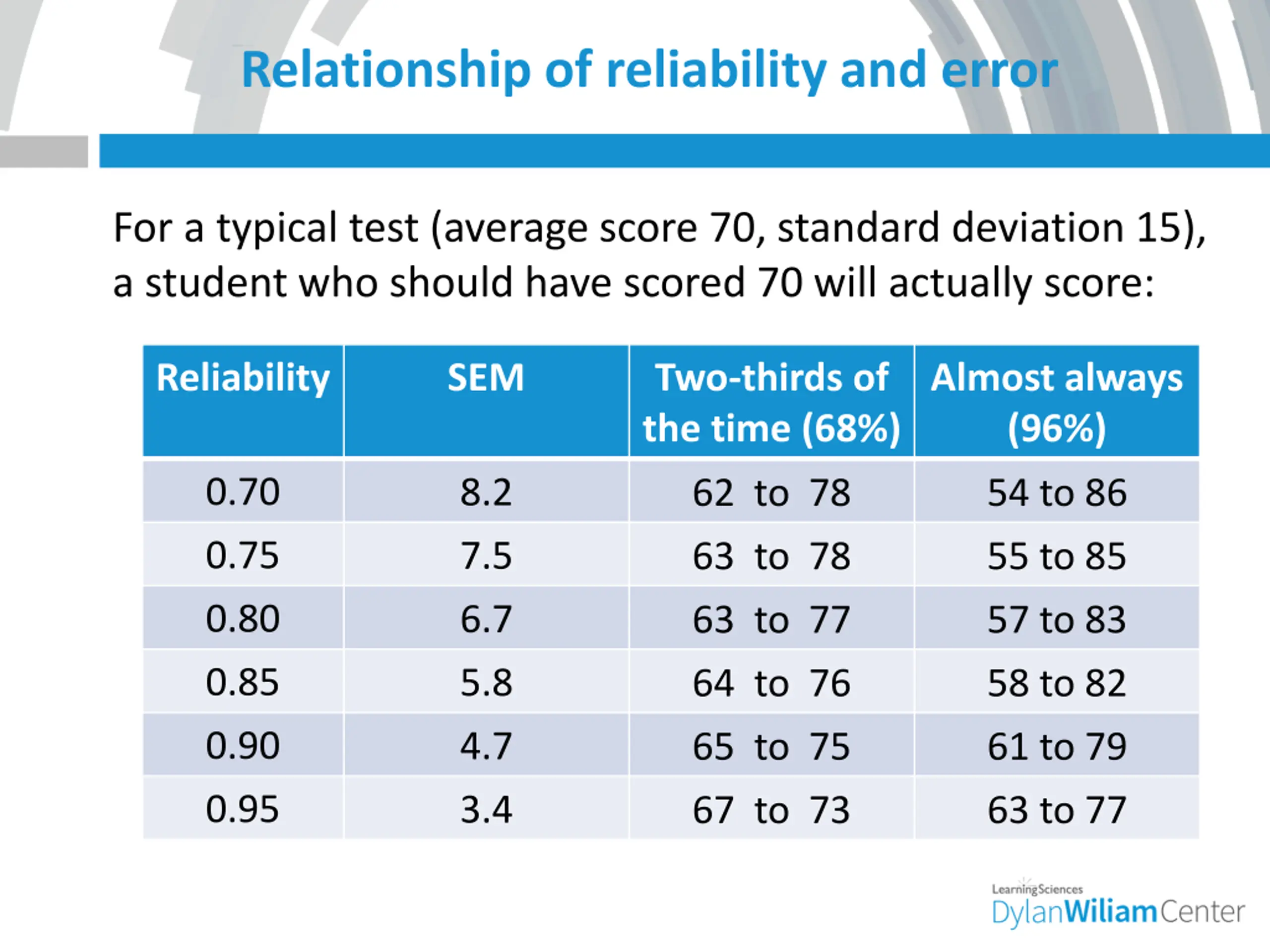 Relationship of reliability and error For a typical test (average score 70, standard deviation 15), a student who should have scored 70 will actually score: Reliability SEM Two-thirds of the time (68%) Almost always (96%) 0.70 8.2 62 to 78 54 to 86 0.75 7.5 6.7 63 to 78 63 to 77 55 to 85 57 to 83 0.80 0.85 5.8 64 to 76 58 to 82 0.90 0.95 4.7 3.4 65 to 75 67 to 73 61 to 79 63 to 77