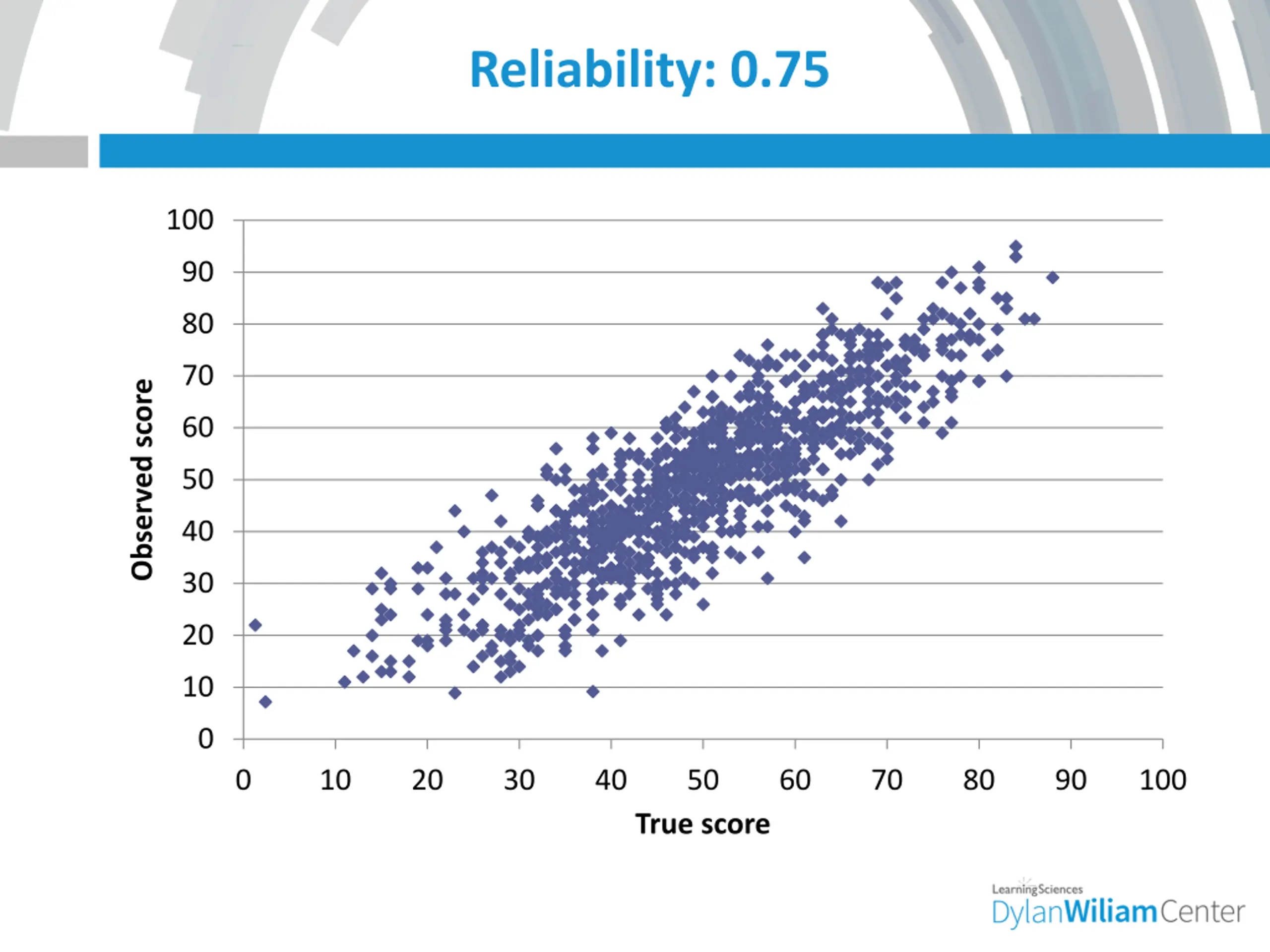 Reliability: 0.75 100 90 80 70 Observed score 60 50 40 30 20 10 0 0 10 20 30 40 50 60 70 80 90 100 True score