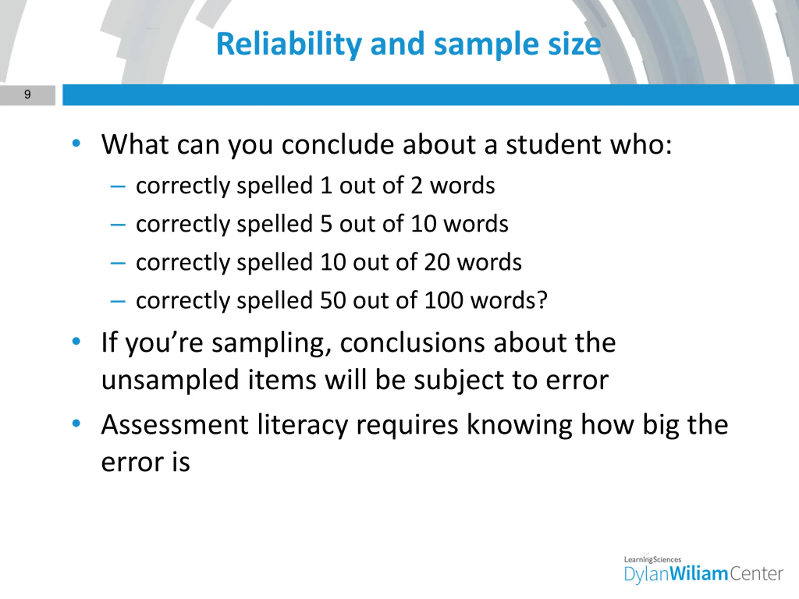 Reliability and sample size 9 What can you conclude about a student who: correctly spelled 1 out of 2 words correctly spelled 5 out of 10 words correctly spelled 10 out of 20 words correctly spelled 50 out of 100 words? If you re sampling, conclusions about the unsampled items will be subject to error Assessment literacy requires knowing how big the error is