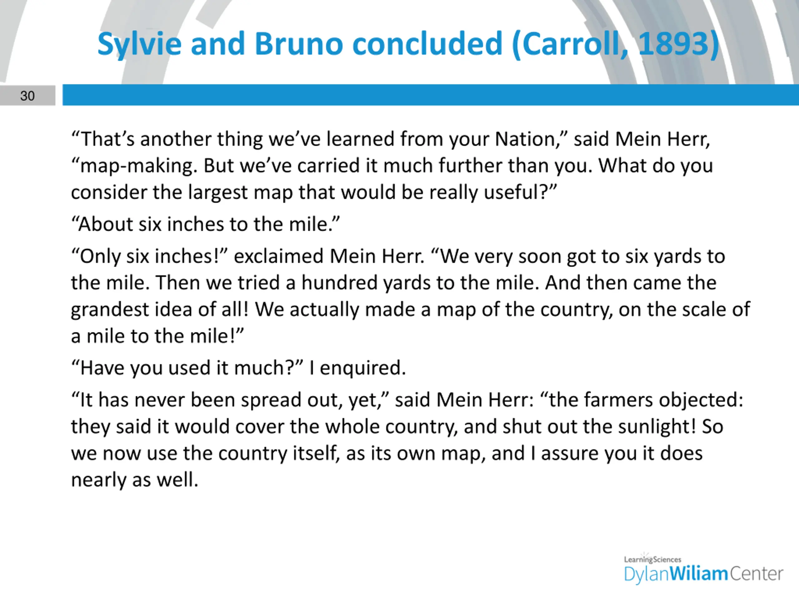 Sylvie and Bruno concluded (Carroll, 1893) 30 That s another thing we ve learned from your Nation, said Mein Herr, map-making. But we ve carried it much further than you. What do you consider the largest map that would be really useful? About six inches to the mile. Only six inches! exclaimed Mein Herr. We very soon got to six yards to the mile. Then we tried a hundred yards to the mile. And then came the grandest idea of all! We actually made a map of the country, on the scale of a mile to the mile! Have you used it much? I enquired. It has never been spread out, yet, said Mein Herr: the farmers objected: they said it would cover the whole country, and shut out the sunlight! So we now use the country itself, as its own map, and I assure you it does nearly as well.
