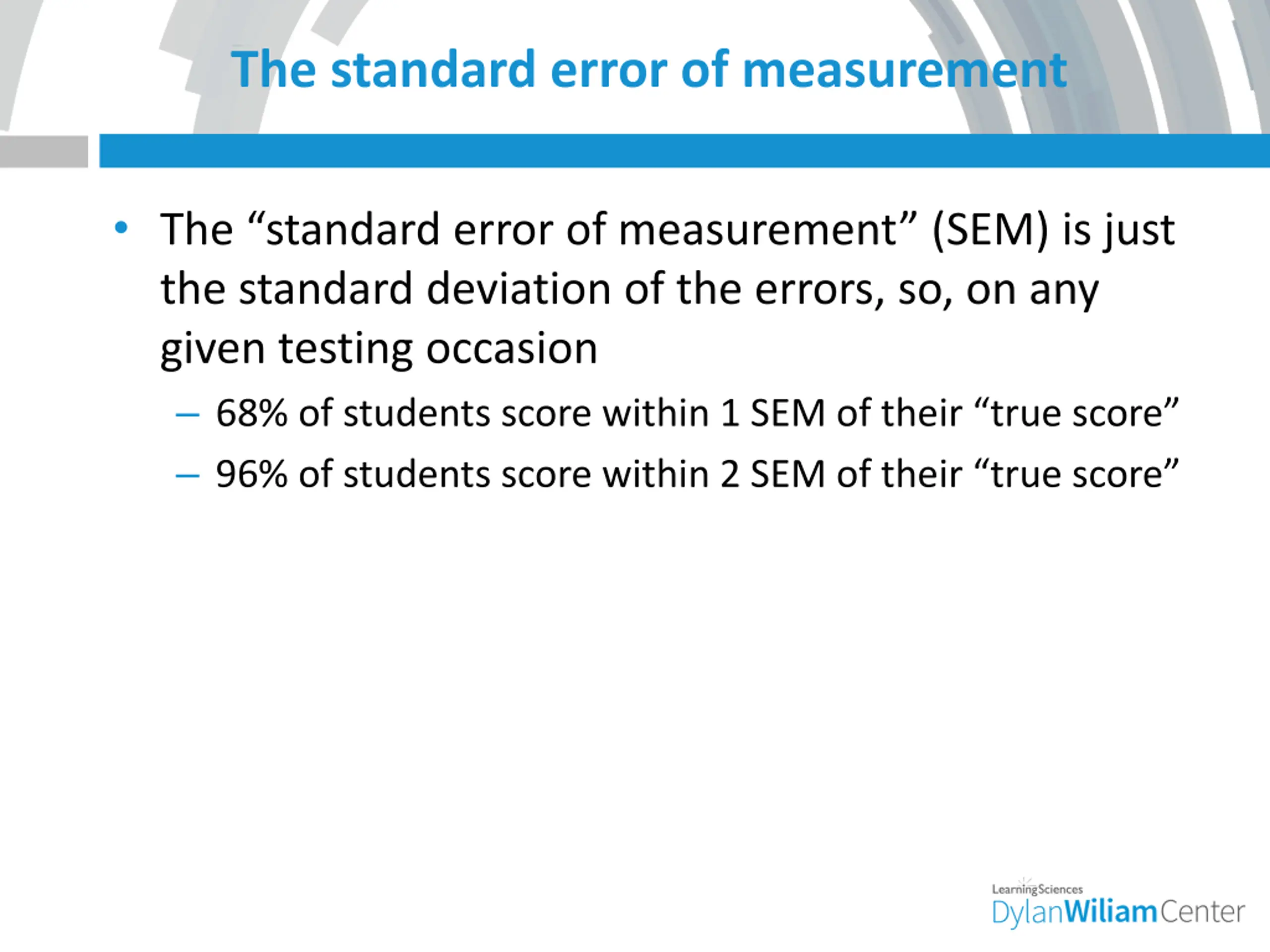 The standard error of measurement The standard error of measurement (SEM) is just the standard deviation of the errors, so, on any given testing occasion 68% of students score within 1 SEM of their true score 96% of students score within 2 SEM of their true score