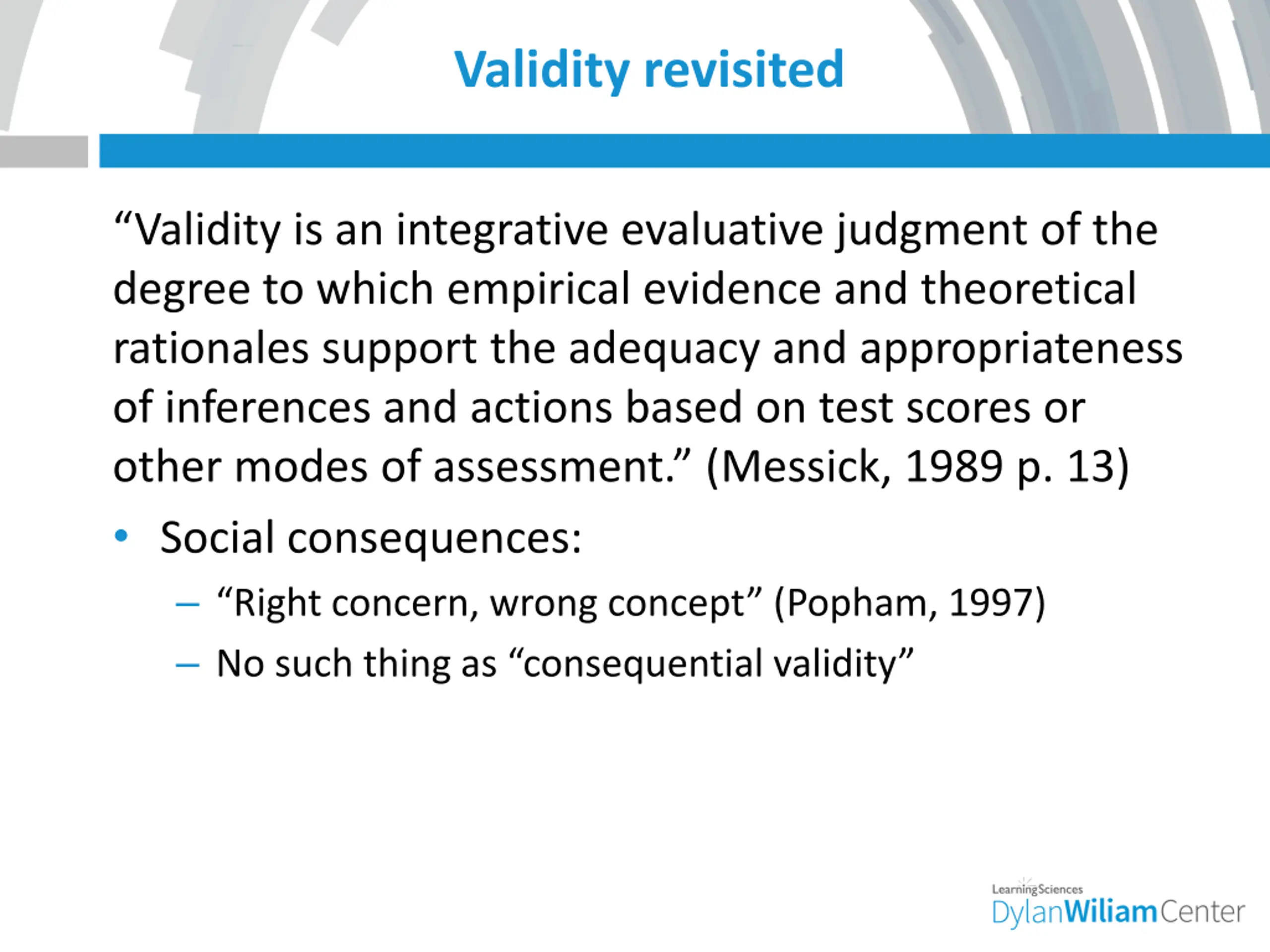 Validity revisited Validity is an integrative evaluative judgment of the degree to which empirical evidence and theoretical rationales support the adequacy and appropriateness of inferences and actions based on test scores or other modes of assessment. (Messick, 1989 p. 13) Social consequences: Right concern, wrong concept (Popham, 1997) No such thing as consequential validity