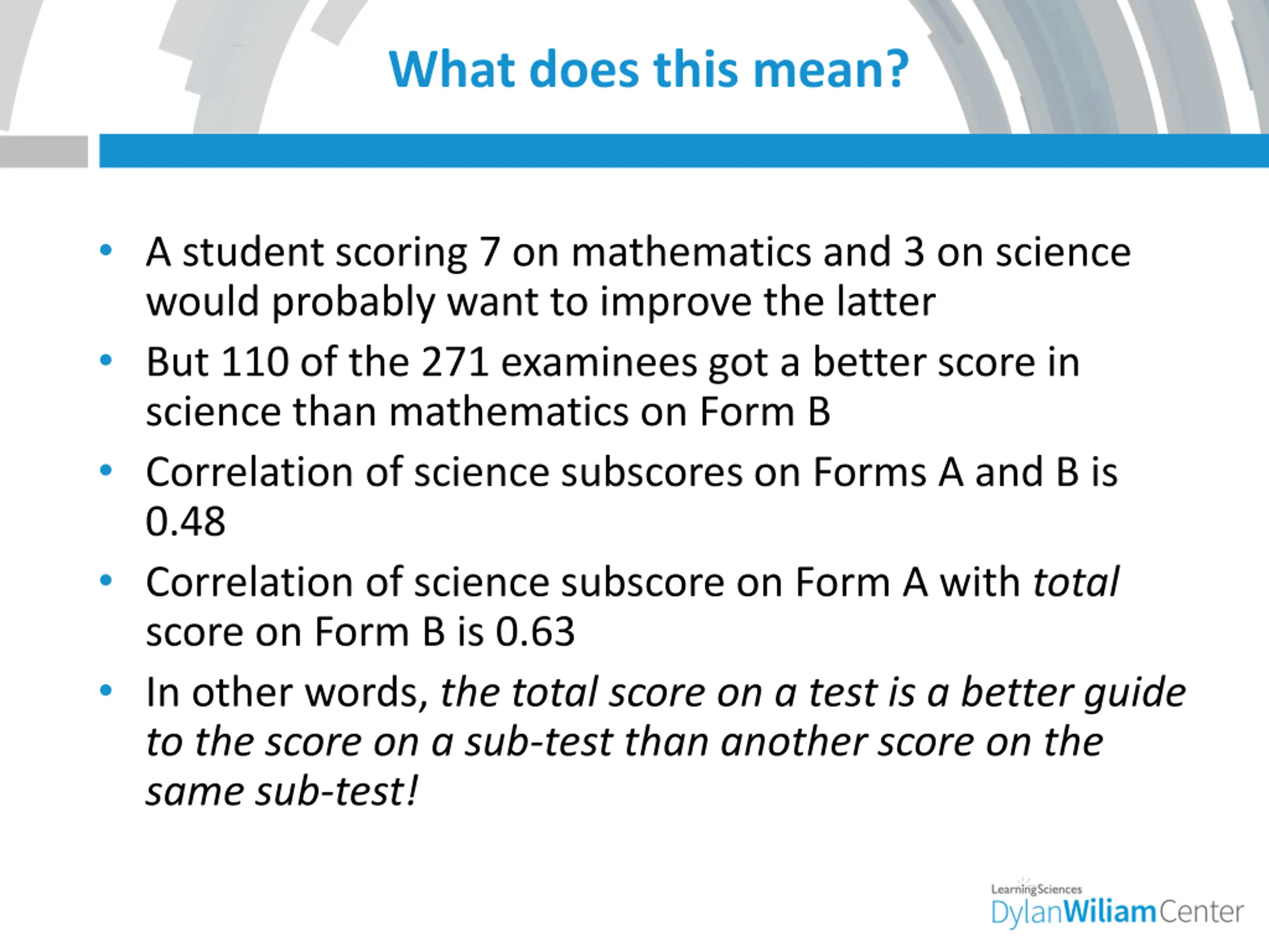 What does this mean? A student scoring 7 on mathematics and 3 on science would probably want to improve the latter But 110 of the 271 examinees got a better score in science than mathematics on Form B Correlation of science subscores on Forms A and B is 0.48 Correlation of science subscore on Form A with total score on Form B is 0.63 In other words, the total score on a test is a better guide to the score on a sub-test than another score on the same sub-test!