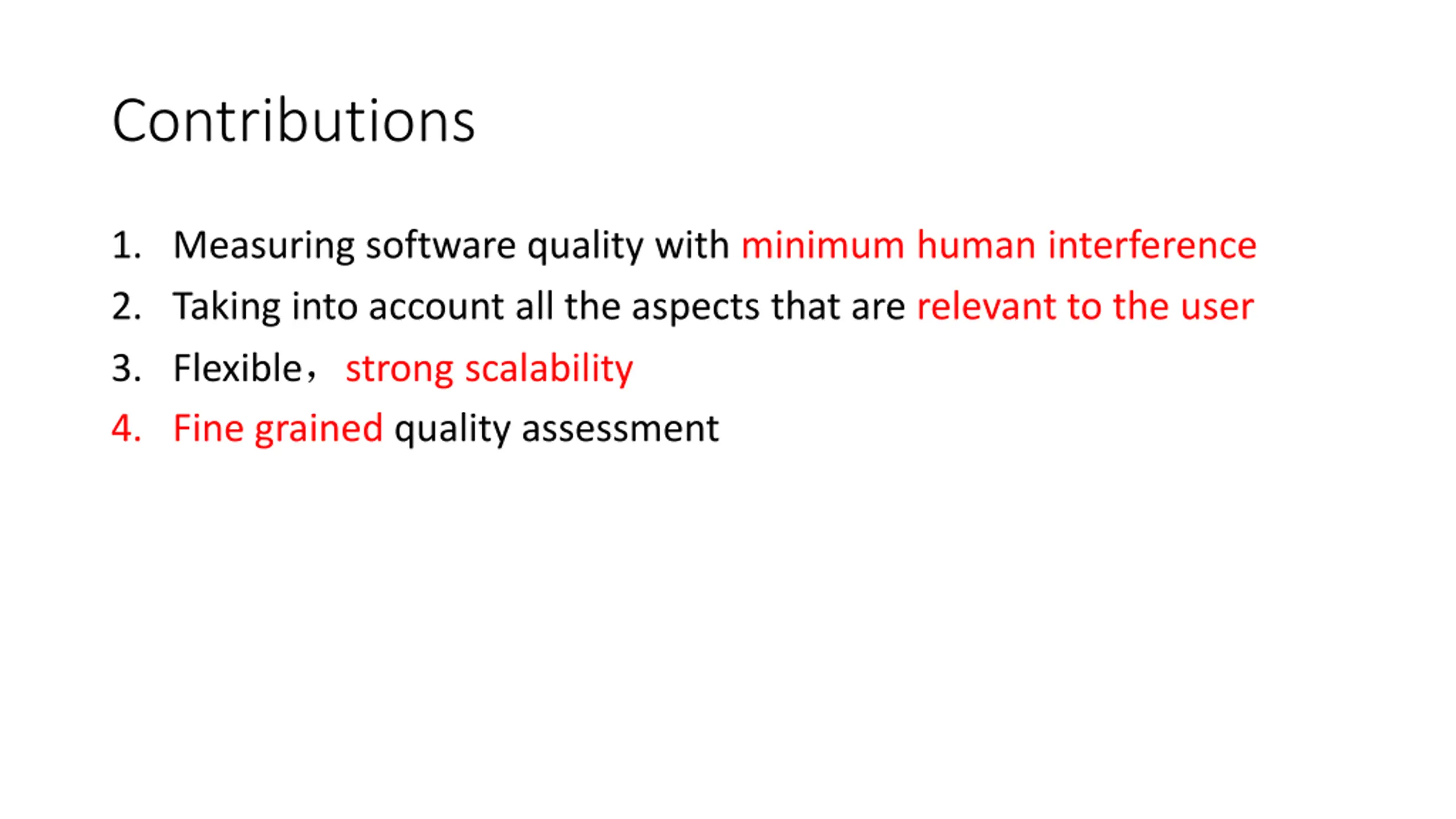 Contributions 1. Measuring software quality with minimum human interference 2. Taking into account all the aspects that are relevant to the user 3. Flexible strong scalability 4. Fine grained quality assessment