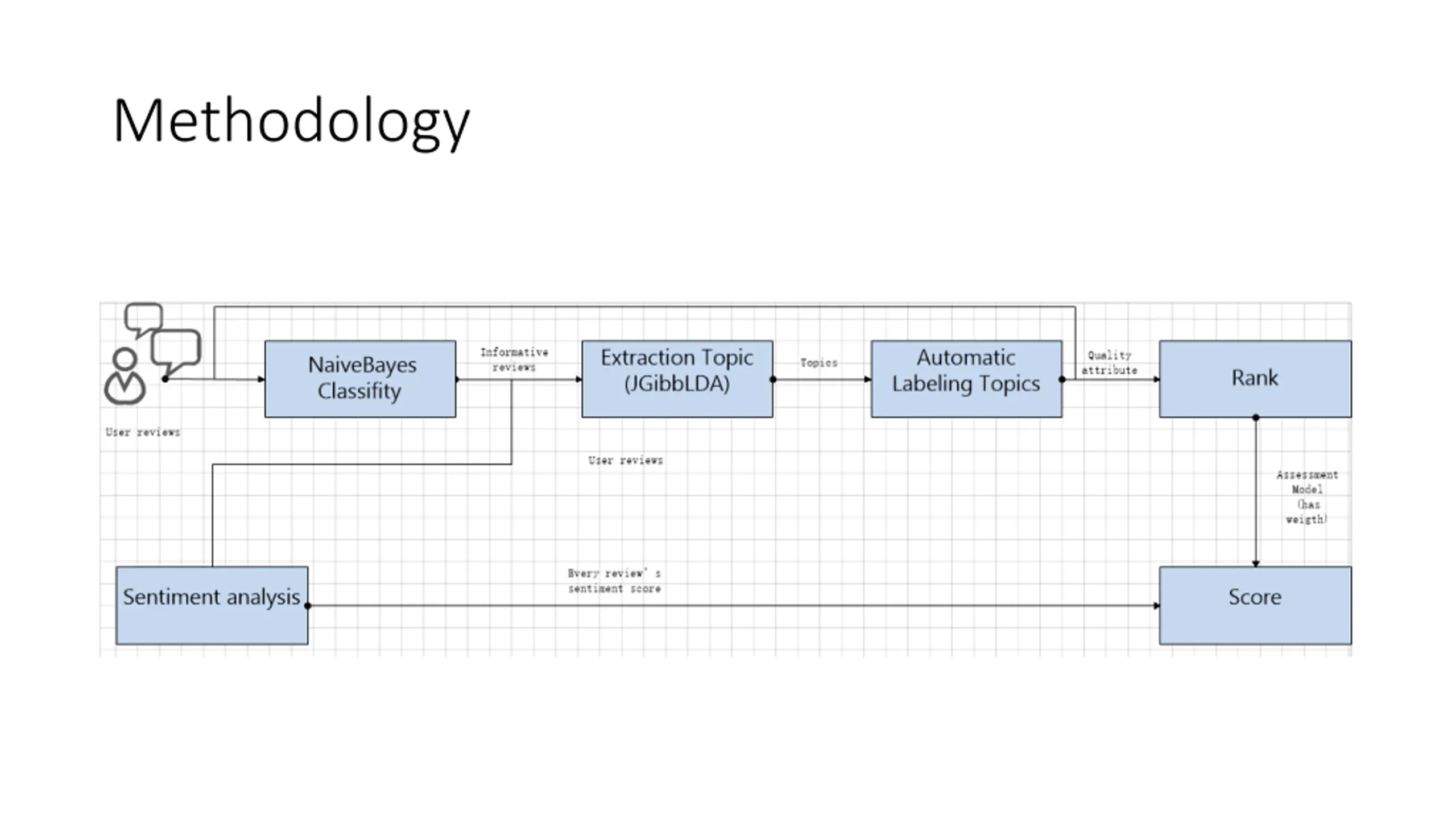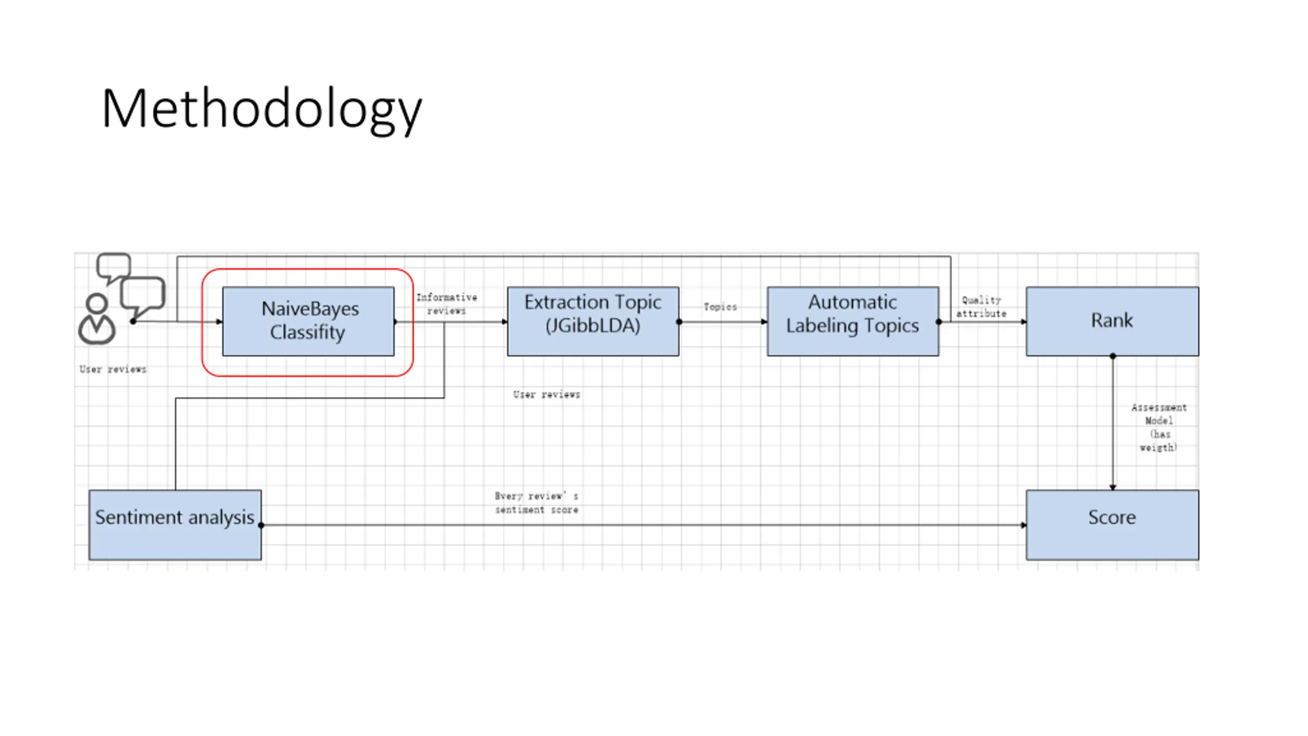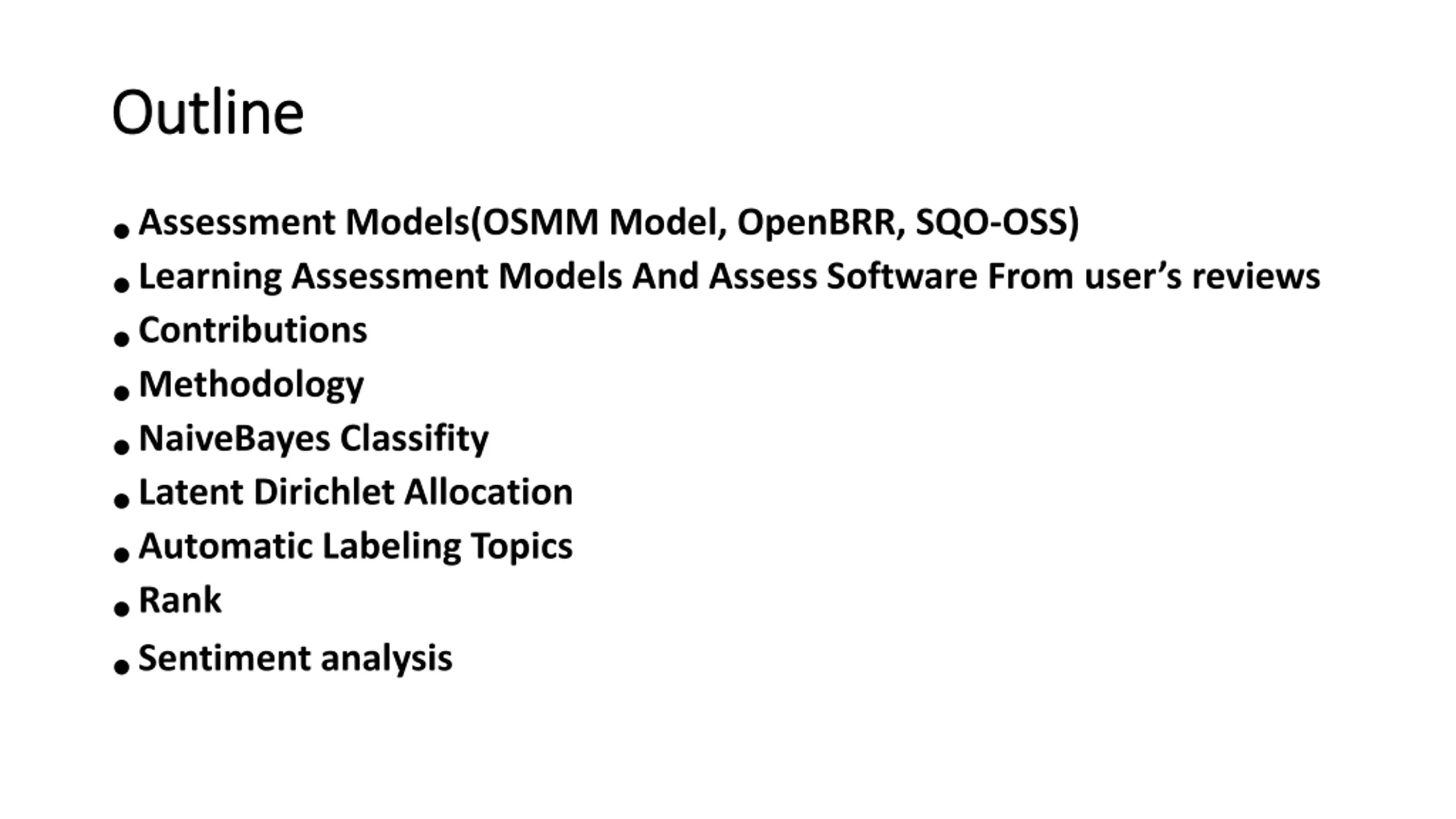 Outline Outline Assessment Models(OSMM Model, OpenBRR, SQO-OSS) Learning Assessment Models And Assess Software From user s reviews Contributions Methodology NaiveBayes Classifity Latent Dirichlet Allocation Automatic Labeling Topics Rank Sentiment analysis