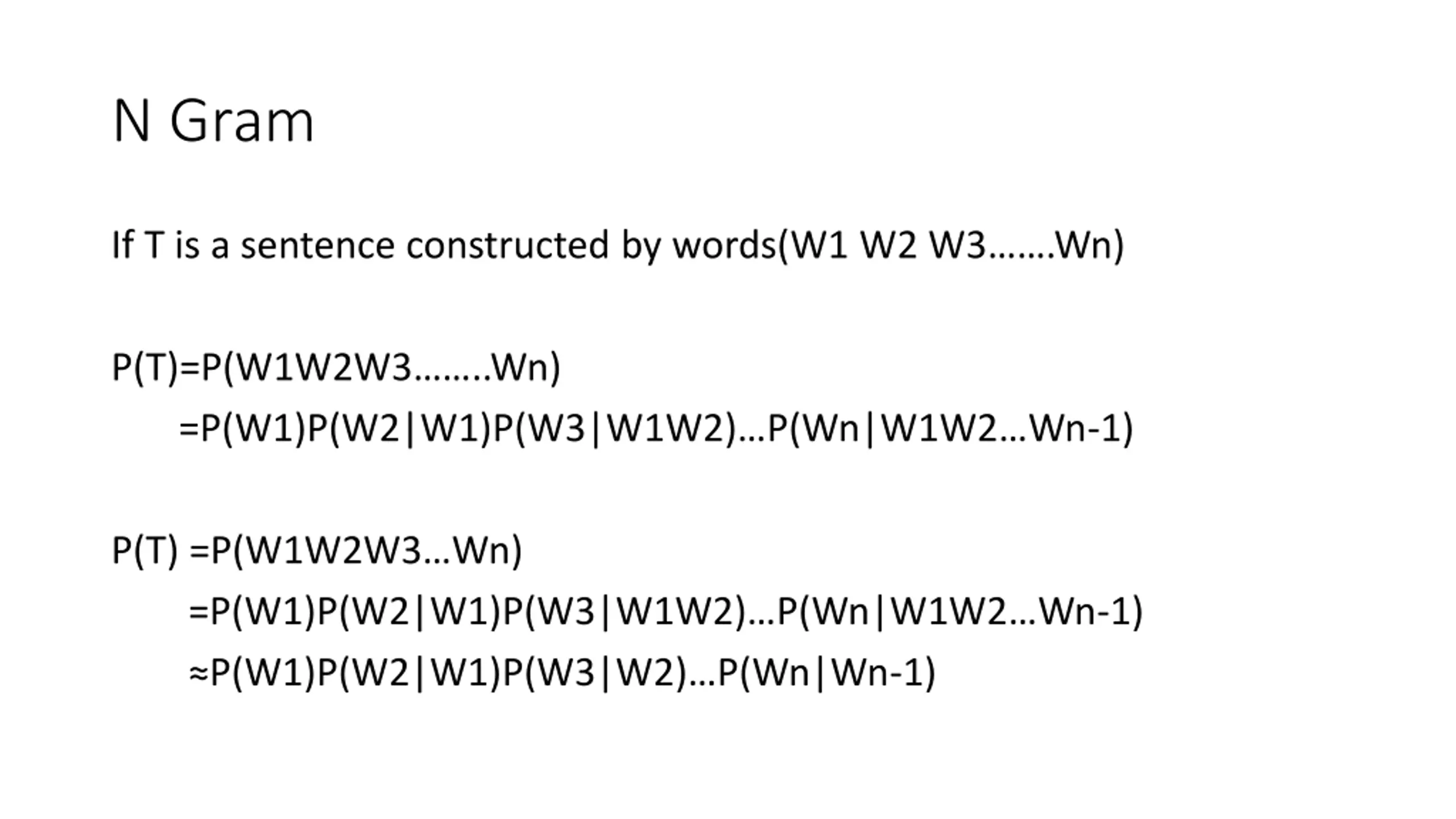 N Gram If T is a sentence constructed by words(W1 W2 W3 .Wn) P(T)=P(W1W2W3 ..Wn) =P(W1)P(W2|W1)P(W3|W1W2) P(Wn|W1W2 Wn-1) P(T) =P(W1W2W3 Wn) =P(W1)P(W2|W1)P(W3|W1W2) P(Wn|W1W2 Wn-1) P(W1)P(W2|W1)P(W3|W2) P(Wn|Wn-1)
