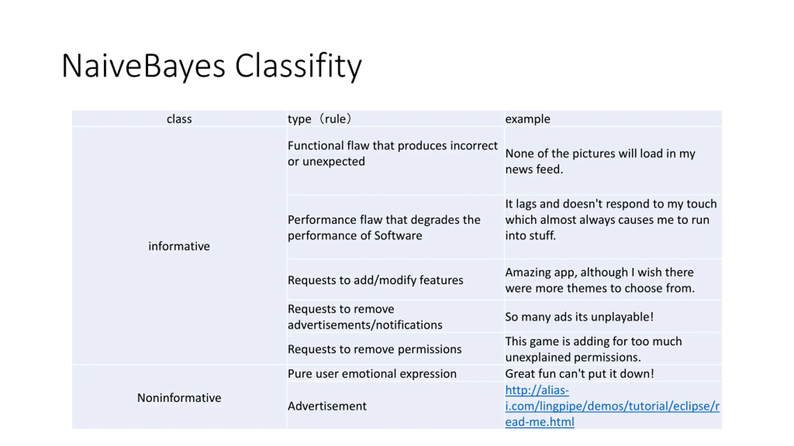 NaiveBayes Classifity type rule class example Functional flaw that produces incorrect or unexpected None of the pictures will load in my news feed. It lags and doesn't respond to my touch which almost always causes me to run into stuff. Performance flaw that degrades the performance of Software informative Amazing app, although I wish there were more themes to choose from. Requests to add/modify features Requests to remove advertisements/notifications So many ads its unplayable! This game is adding for too much unexplained permissions. Great fun can't put it down! http://alias- i.com/lingpipe/demos/tutorial/eclipse/r ead-me.html Requests to remove permissions Pure user emotional expression Noninformative Advertisement