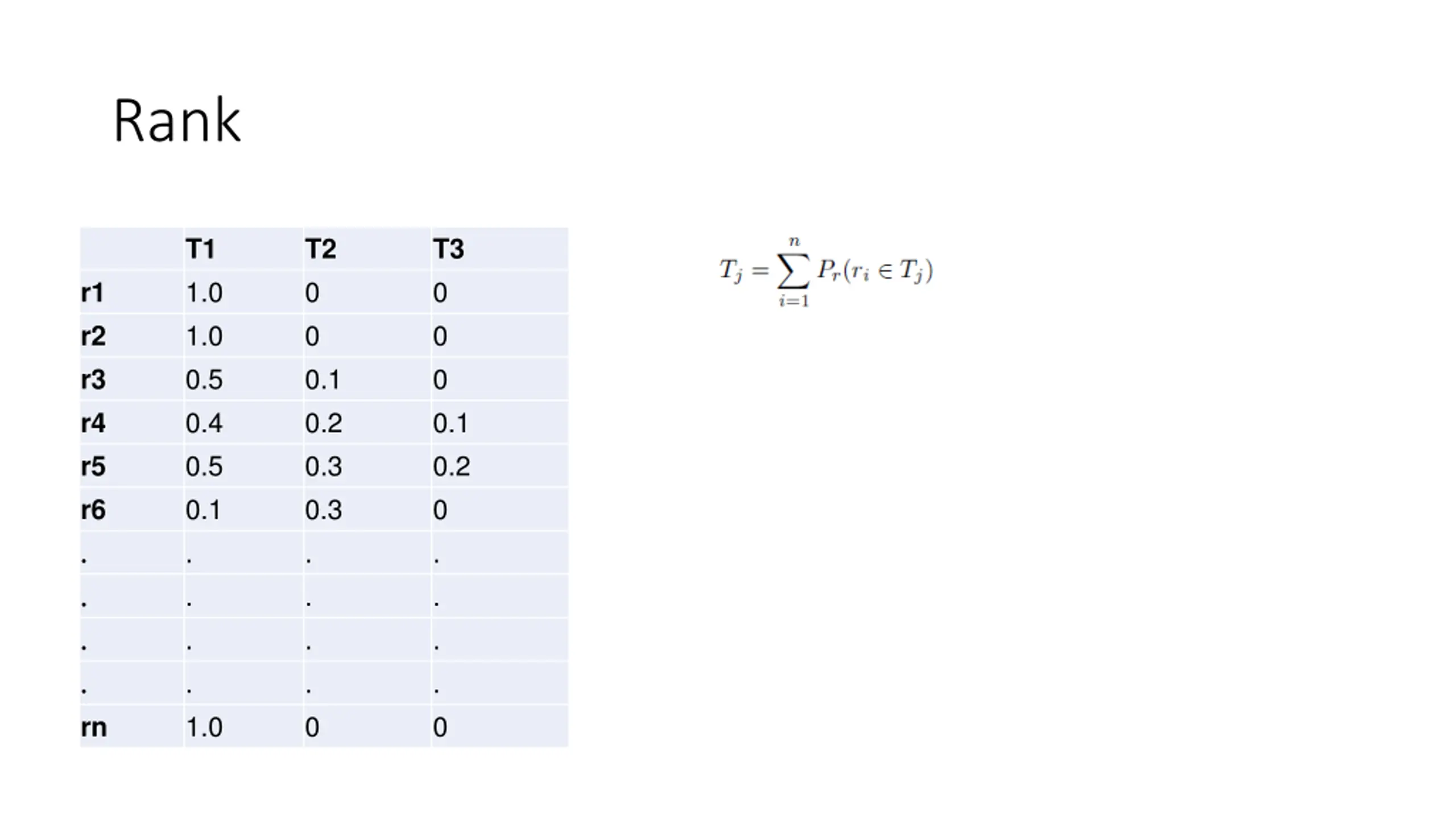 Rank T1 1.0 1.0 0.5 0.4 0.5 0.1 . . . . 1.0 T2 0 0 0.1 0.2 0.3 0.3 . . . . 0 T3 0 0 0 0.1 0.2 0 . . . . 0 r1 r2 r3 r4 r5 r6 . . . . . . . . rn