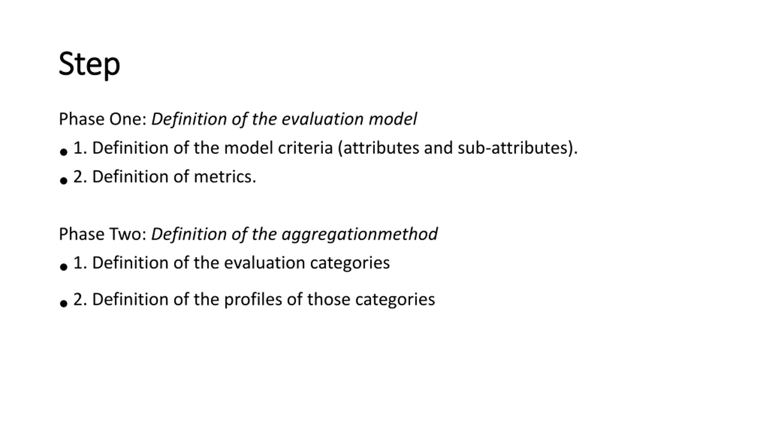 Step Step Phase One: Definition of the evaluation model 1. Definition of the model criteria (attributes and sub-attributes). 2. Definition of metrics. Phase Two: Definition of the aggregationmethod 1. Definition of the evaluation categories 2. Definition of the profiles of those categories
