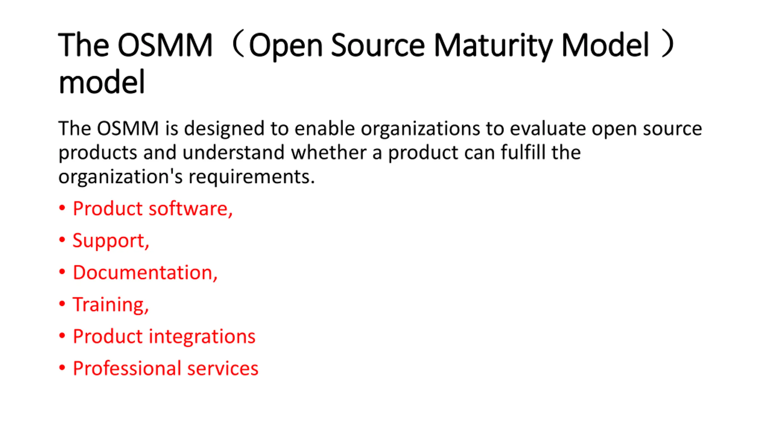 The OSMM The OSMM model model Open Source Maturity Model Open Source Maturity Model The OSMM is designed to enable organizations to evaluate open source products and understand whether a product can fulfill the organization's requirements. Product software, Support, Documentation, Training, Product integrations Professional services