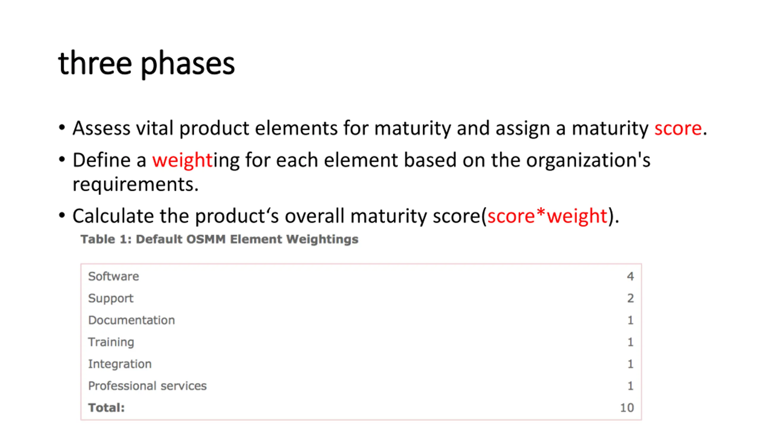 three phases three phases Assess vital product elements for maturity and assign a maturity score. Define a weighting for each element based on the organization's requirements. Calculate the product s overall maturity score(score*weight).