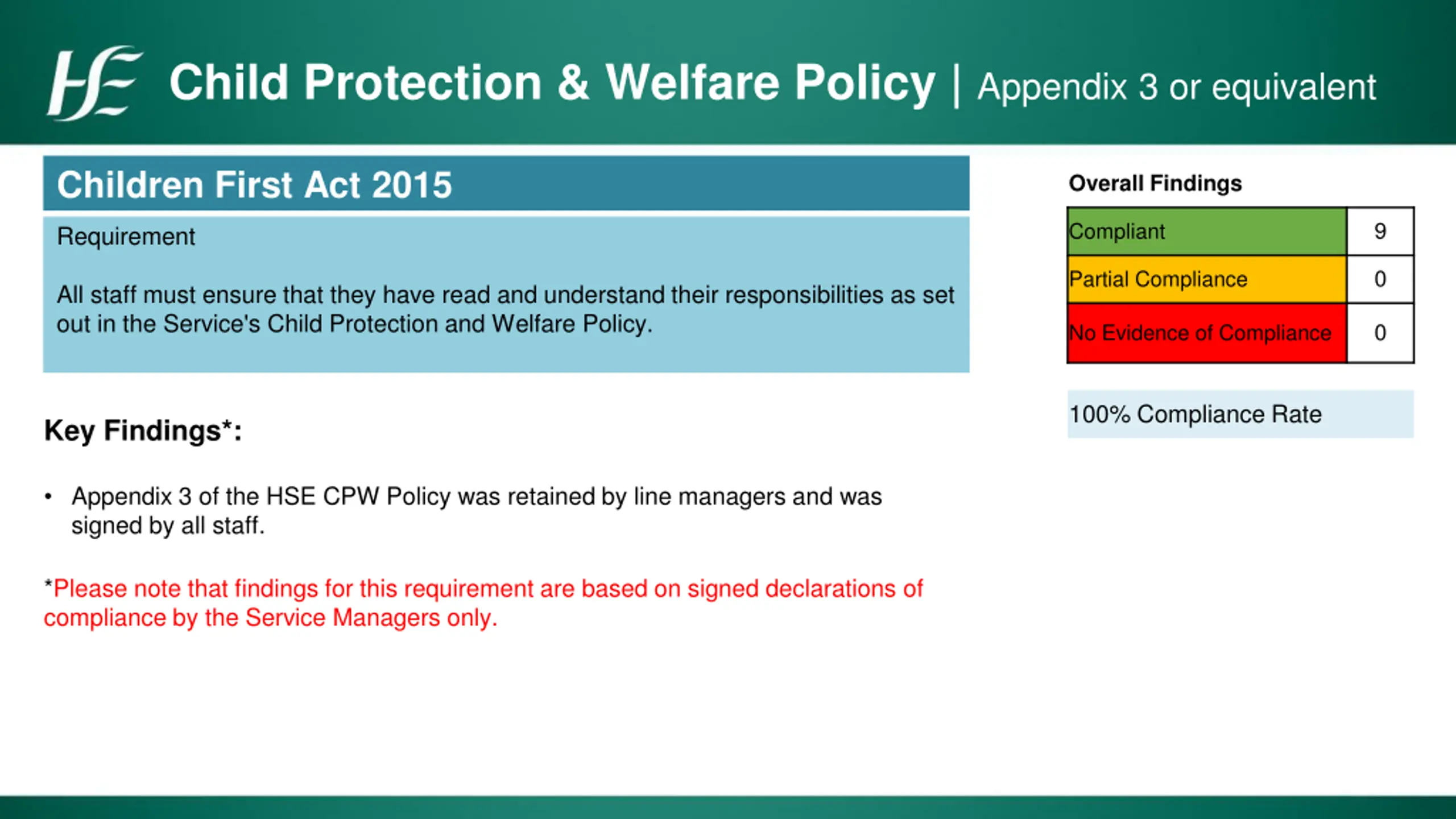 Child Protection & Welfare Policy | Appendix 3 or equivalent Children First Act 2015 Overall Findings 9 Compliant Requirement 0 Partial Compliance All staff must ensure that they have read and understand their responsibilities as set out in the Service's Child Protection and Welfare Policy. 0 No Evidence of Compliance 100% Compliance Rate Key Findings*: Appendix 3 of the HSE CPW Policy was retained by line managers and was signed by all staff. *Please note that findings for this requirement are based on signed declarations of compliance by the Service Managers only.