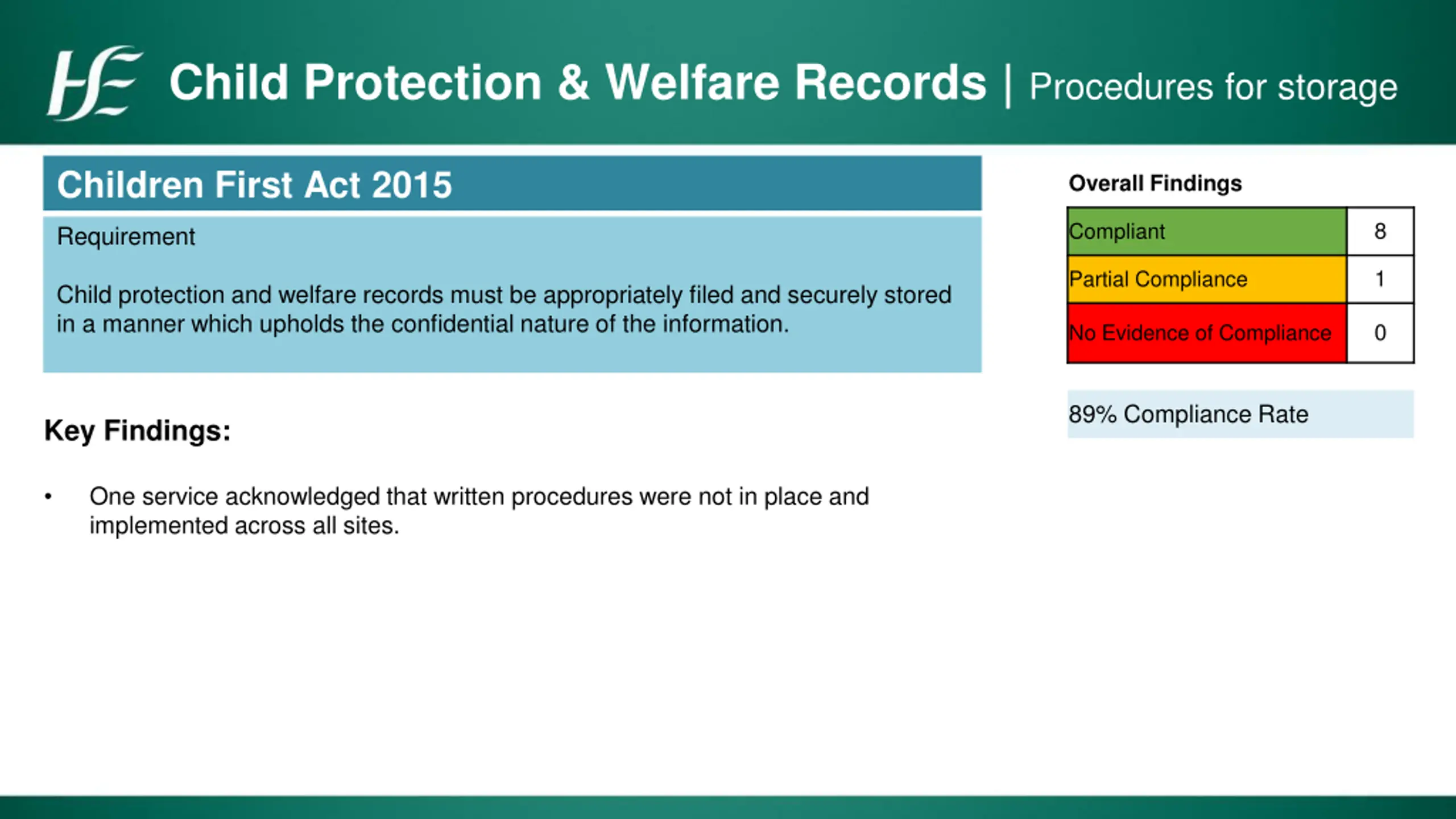 Child Protection & Welfare Records | Procedures for storage Children First Act 2015 Overall Findings 8 Compliant Requirement 1 Partial Compliance Child protection and welfare records must be appropriately filed and securely stored in a manner which upholds the confidential nature of the information. 0 No Evidence of Compliance 89% Compliance Rate Key Findings: One service acknowledged that written procedures were not in place and implemented across all sites.