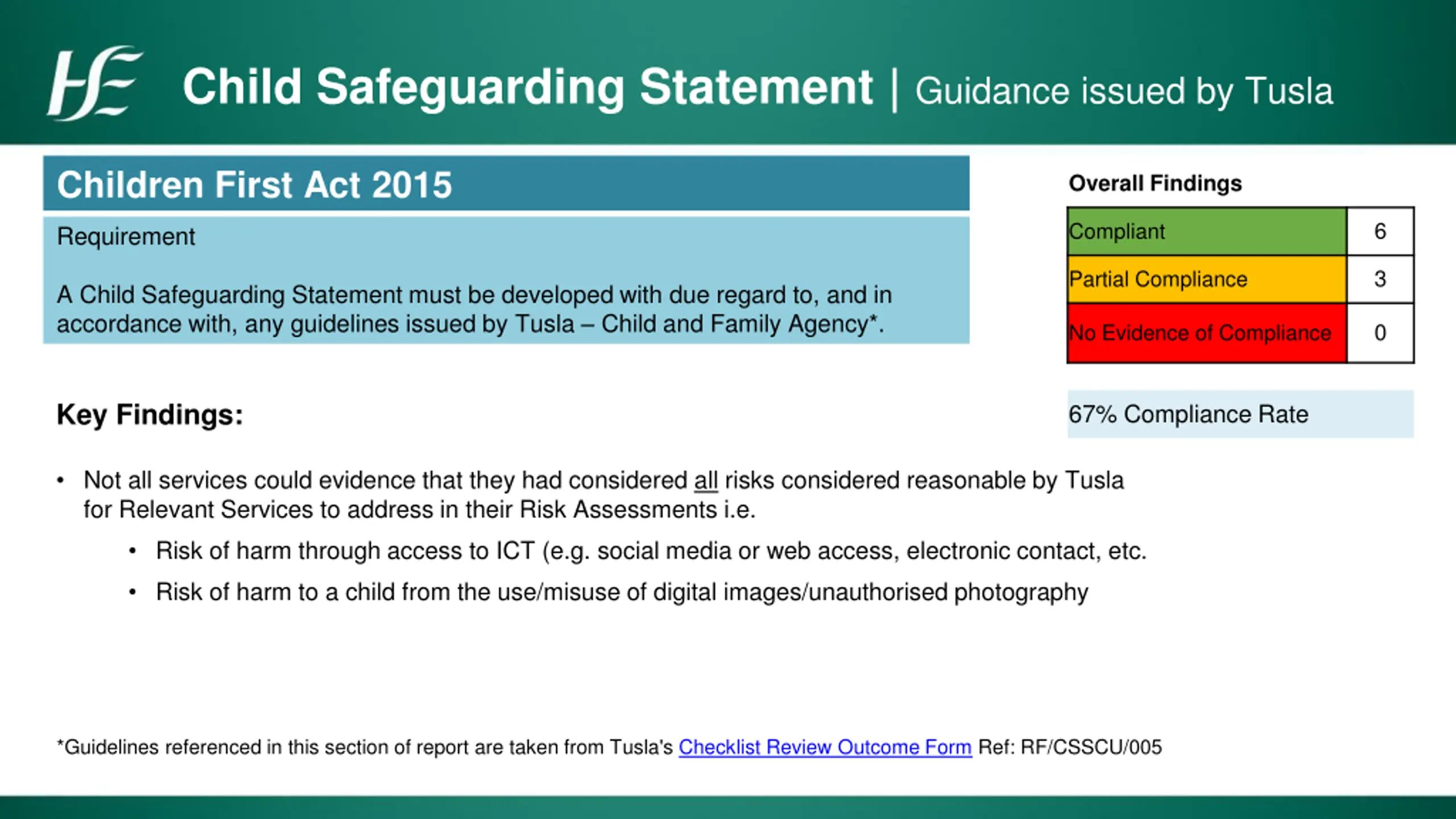Child Safeguarding Statement | Guidance issued by Tusla Children First Act 2015 Overall Findings 6 Compliant Requirement 3 Partial Compliance A Child Safeguarding Statement must be developed with due regard to, and in accordance with, any guidelines issued by Tusla Child and Family Agency*. 0 No Evidence of Compliance Key Findings: 67% Compliance Rate Not all services could evidence that they had considered all risks considered reasonable by Tusla for Relevant Services to address in their Risk Assessments i.e. Risk of harm through access to ICT (e.g. social media or web access, electronic contact, etc. Risk of harm to a child from the use/misuse of digital images/unauthorised photography *Guidelines referenced in this section of report are taken from Tusla's Checklist Review Outcome Form Ref: RF/CSSCU/005