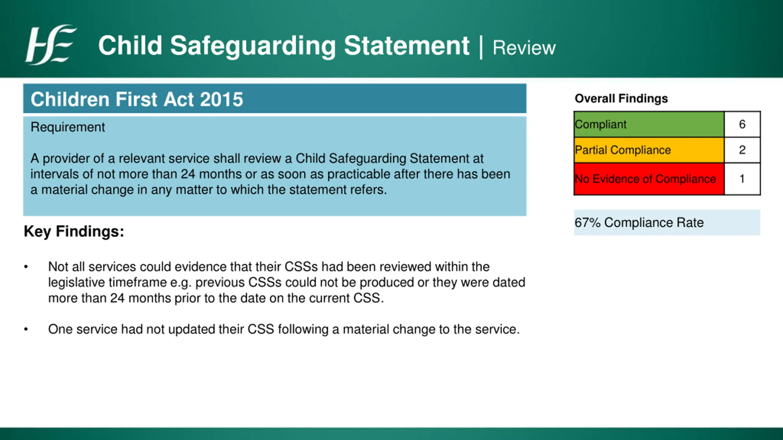 Child Safeguarding Statement | Review Children First Act 2015 Overall Findings 6 Compliant Requirement 2 Partial Compliance A provider of a relevant service shall review a Child Safeguarding Statement at intervals of not more than 24 months or as soon as practicable after there has been a material change in any matter to which the statement refers. 1 No Evidence of Compliance 67% Compliance Rate Key Findings: Not all services could evidence that their CSSs had been reviewed within the legislative timeframe e.g. previous CSSs could not be produced or they were dated more than 24 months prior to the date on the current CSS. One service had not updated their CSS following a material change to the service.