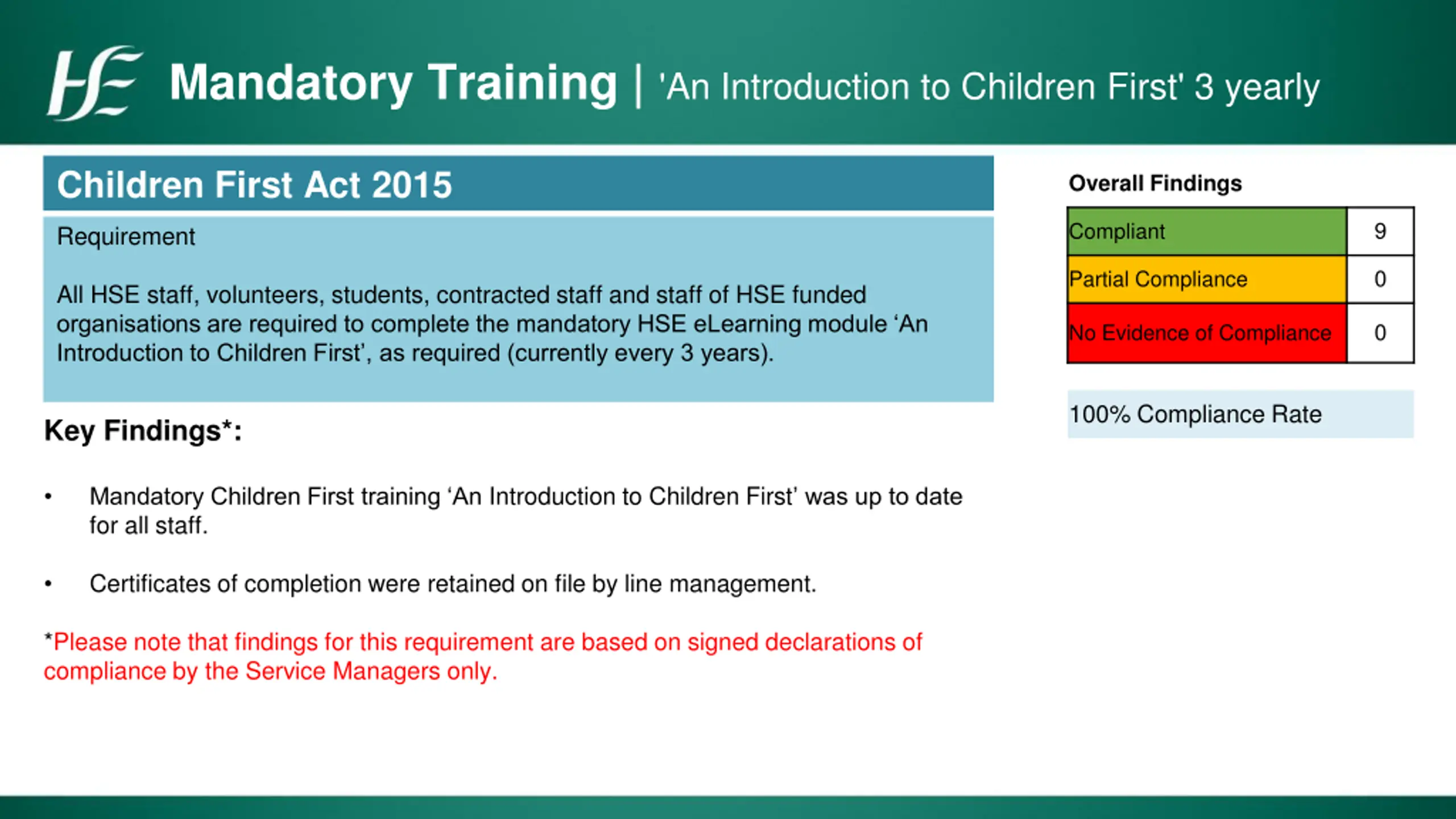 Mandatory Training | 'An Introduction to Children First' 3 yearly Children First Act 2015 Overall Findings 9 Compliant Requirement 0 Partial Compliance All HSE staff, volunteers, students, contracted staff and staff of HSE funded organisations are required to complete the mandatory HSE eLearning module An Introduction to Children First , as required (currently every 3 years). 0 No Evidence of Compliance 100% Compliance Rate Key Findings*: Mandatory Children First training An Introduction to Children First was up to date for all staff. Certificates of completion were retained on file by line management. *Please note that findings for this requirement are based on signed declarations of compliance by the Service Managers only.