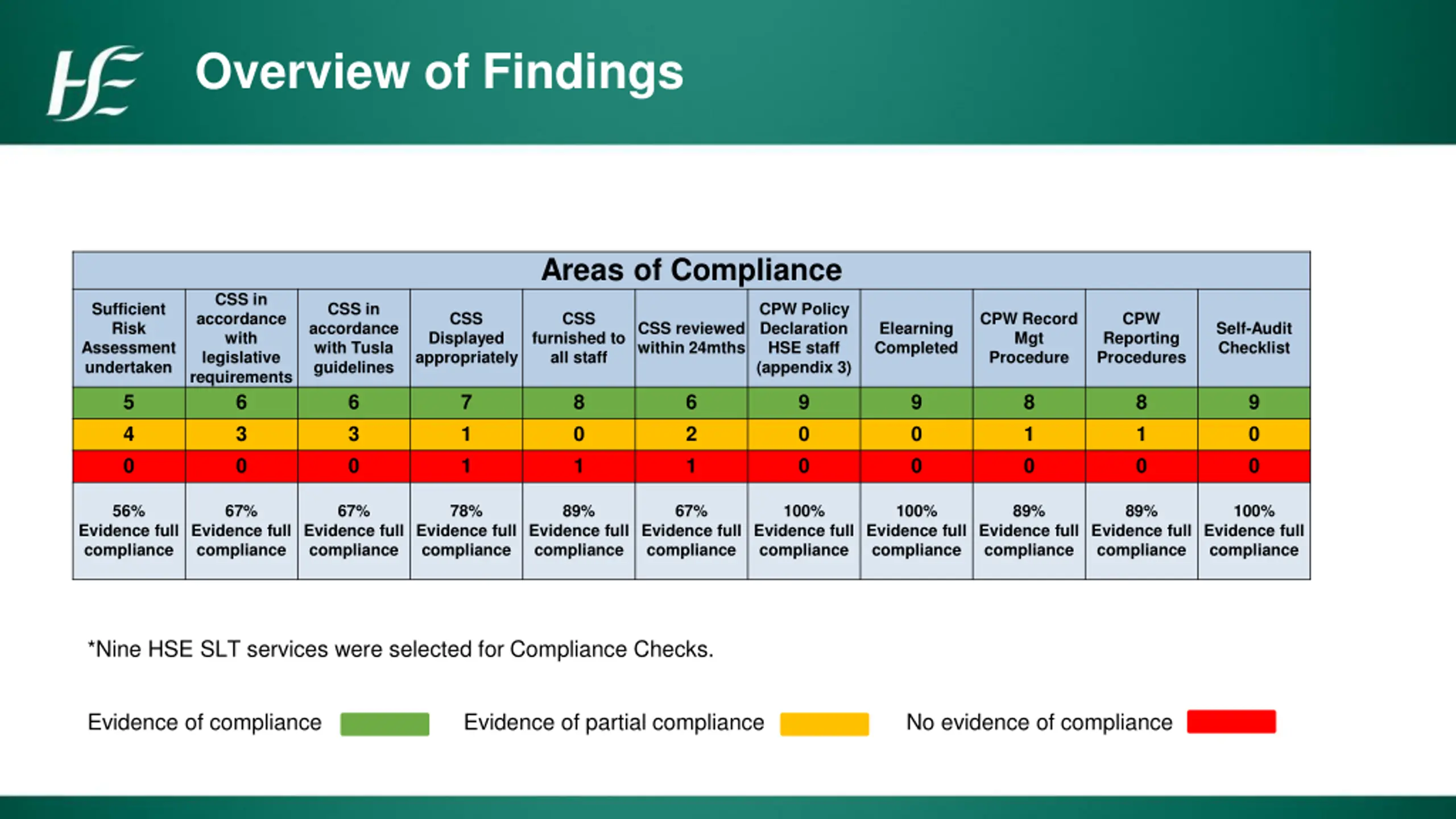 Overview of Findings Areas of Compliance CSS in accordance with legislative requirements 6 3 0 Sufficient Risk Assessment undertaken CSS in accordance with Tusla guidelines CPW Policy Declaration HSE staff (appendix 3) CSS CSS CPW Record Mgt Procedure CPW Reporting Procedures CSS reviewed within 24mths Elearning Completed Self-Audit Checklist Displayed appropriately furnished to all staff 5 4 0 6 3 0 7 1 1 8 0 1 6 2 1 9 0 0 9 0 0 8 1 0 8 1 0 9 0 0 56% 67% 67% 78% 89% 67% 100% 100% 89% 89% 100% Evidence full compliance Evidence full compliance Evidence full compliance Evidence full compliance Evidence full compliance Evidence full compliance Evidence full compliance Evidence full compliance Evidence full compliance Evidence full compliance Evidence full compliance *Nine HSE SLT services were selected for Compliance Checks. Evidence of compliance Evidence of partial compliance No evidence of compliance