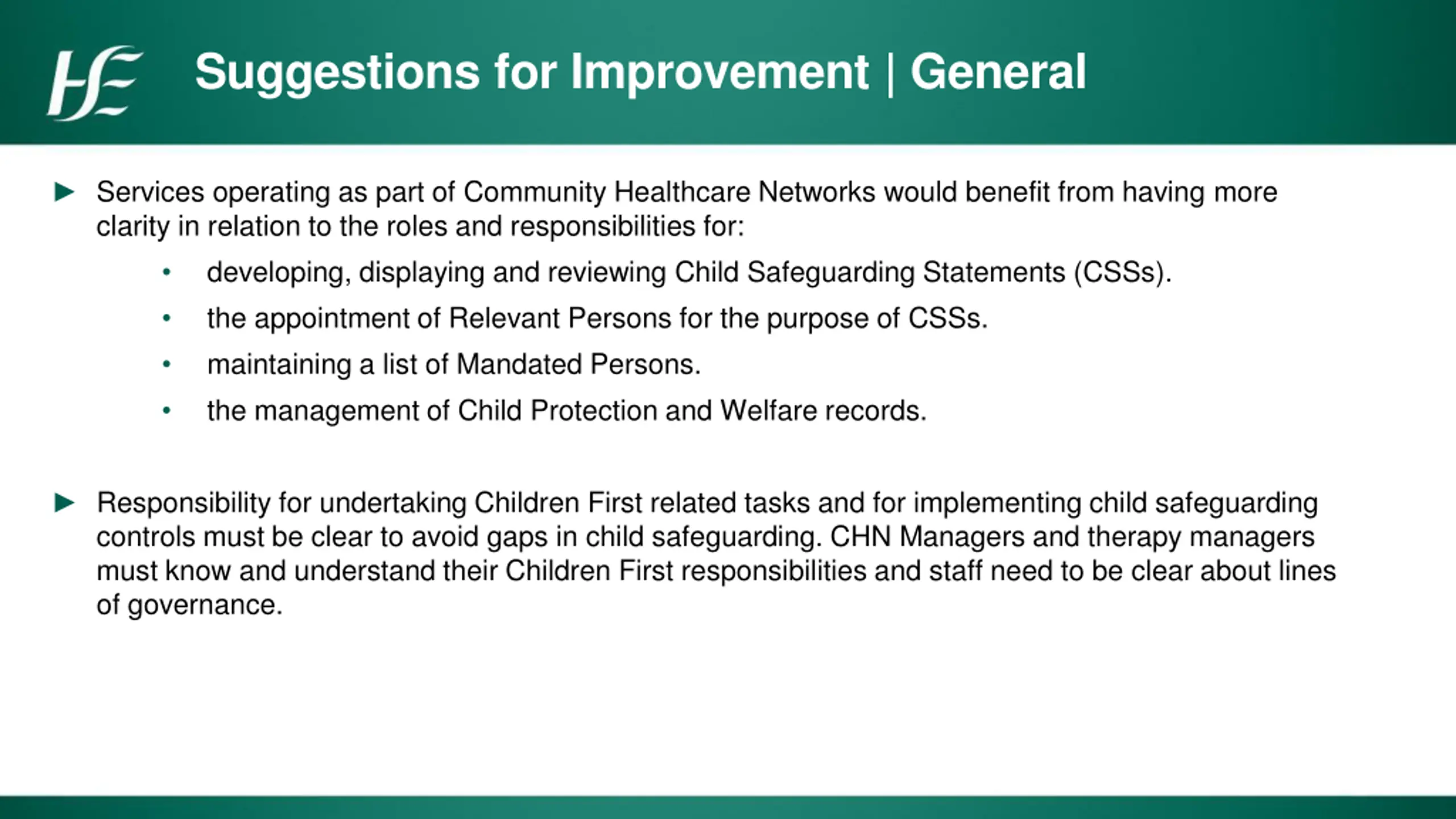 Suggestions for Improvement | General Services operating as part of Community Healthcare Networks would benefit from having more clarity in relation to the roles and responsibilities for: developing, displaying and reviewing Child Safeguarding Statements (CSSs). the appointment of Relevant Persons for the purpose of CSSs. maintaining a list of Mandated Persons. the management of Child Protection and Welfare records. Responsibility for undertaking Children First related tasks and for implementing child safeguarding controls must be clear to avoid gaps in child safeguarding. CHN Managers and therapy managers must know and understand their Children First responsibilities and staff need to be clear about lines of governance.
