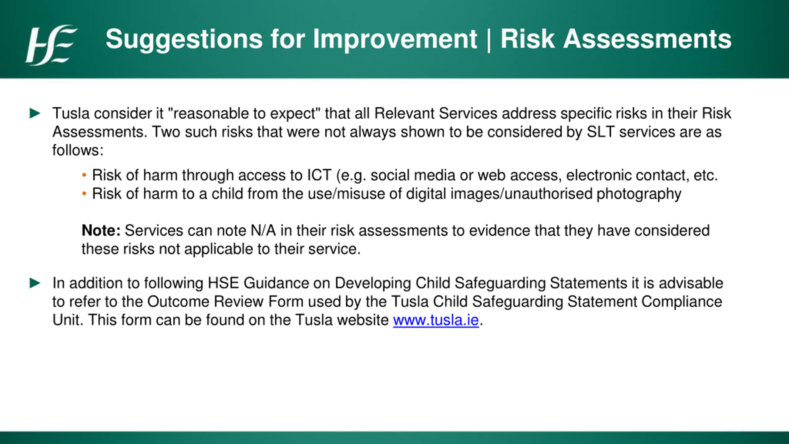 Suggestions for Improvement | Risk Assessments Tusla consider it "reasonable to expect" that all Relevant Services address specific risks in their Risk Assessments. Two such risks that were not always shown to be considered by SLT services are as follows: Risk of harm through access to ICT (e.g. social media or web access, electronic contact, etc. Risk of harm to a child from the use/misuse of digital images/unauthorised photography Note: Services can note N/A in their risk assessments to evidence that they have considered these risks not applicable to their service. In addition to following HSE Guidance on Developing Child Safeguarding Statements it is advisable to refer to the Outcome Review Form used by the Tusla Child Safeguarding Statement Compliance Unit. This form can be found on the Tusla website www.tusla.ie.