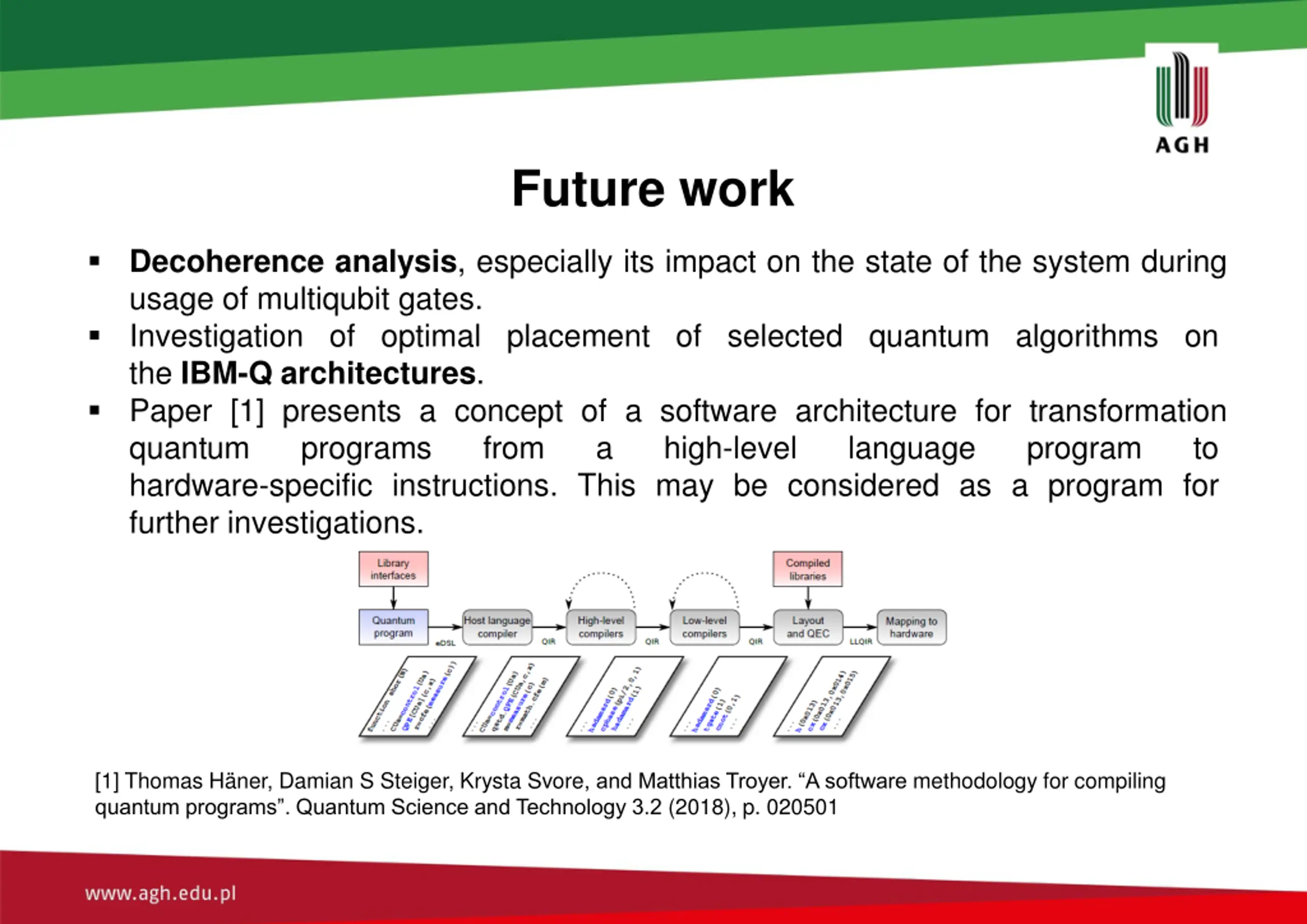 Future work Decoherence analysis, especially its impact on the state of the system during usage of multiqubit gates. Investigation of optimal placement of selected quantum algorithms on the IBM-Q architectures. Paper [1] presents a concept of a software architecture for transformation quantum programs from a hardware-specific instructions. This may be considered as a program for further investigations. high-level language program to [1] Thomas H ner, Damian S Steiger, Krysta Svore, and Matthias Troyer. A software methodology for compiling quantum programs . Quantum Science and Technology 3.2 (2018), p. 020501