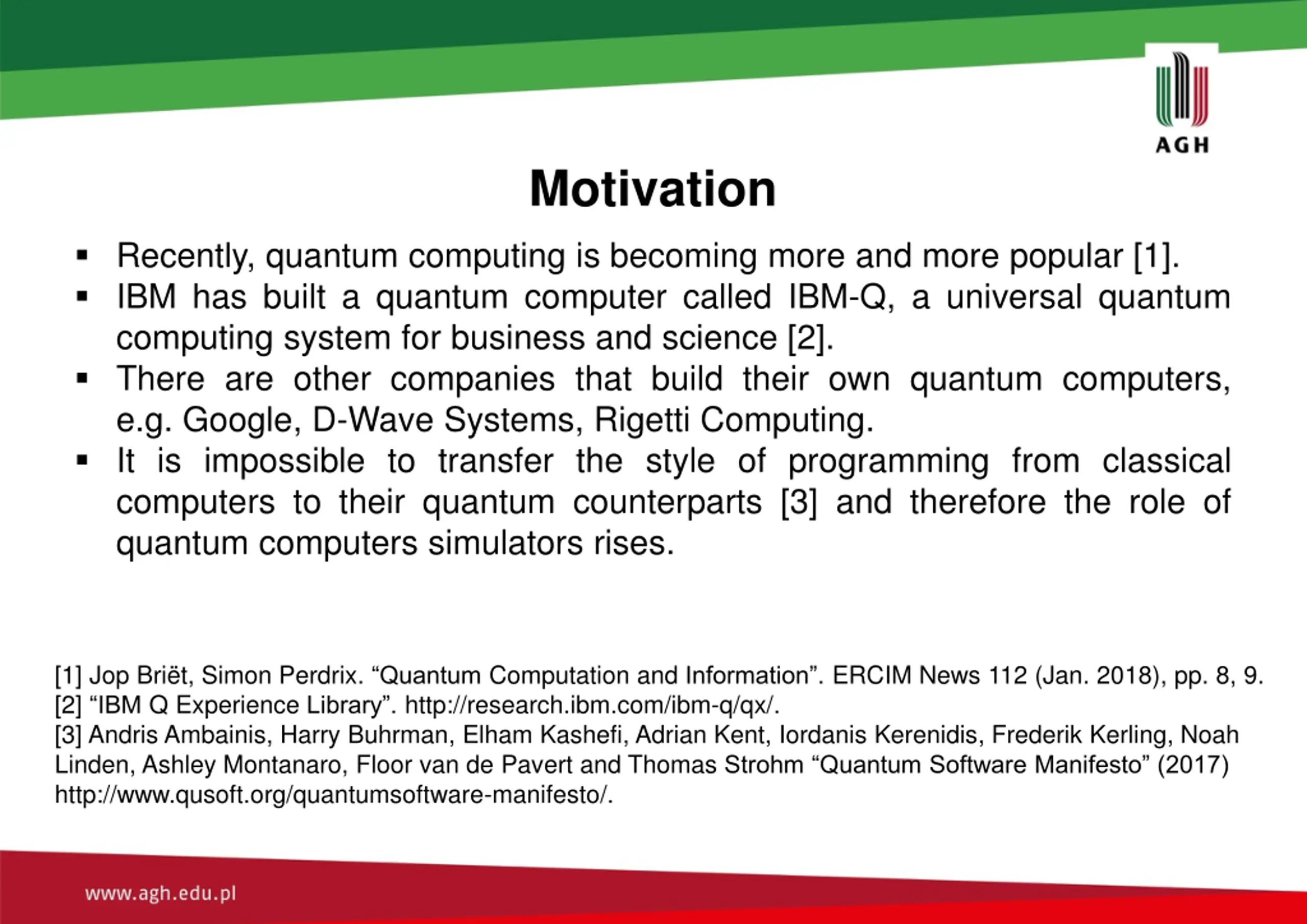 Motivation Recently, quantum computing is becoming more and more popular [1]. IBM has built a quantum computer called IBM-Q, a universal quantum computing system for business and science [2]. There are other companies that build their own quantum computers, e.g. Google, D-Wave Systems, Rigetti Computing. It is impossible to transfer the style of programming from classical computers to their quantum counterparts [3] and therefore the role of quantum computers simulators rises. [1] Jop Bri t, Simon Perdrix. Quantum Computation and Information . ERCIM News 112 (Jan. 2018), pp. 8, 9. [2] IBM Q Experience Library . http://research.ibm.com/ibm-q/qx/. [3] Andris Ambainis, Harry Buhrman, Elham Kashefi, Adrian Kent, Iordanis Kerenidis, Frederik Kerling, Noah Linden, Ashley Montanaro, Floor van de Pavert and Thomas Strohm Quantum Software Manifesto (2017) http://www.qusoft.org/quantumsoftware-manifesto/.
